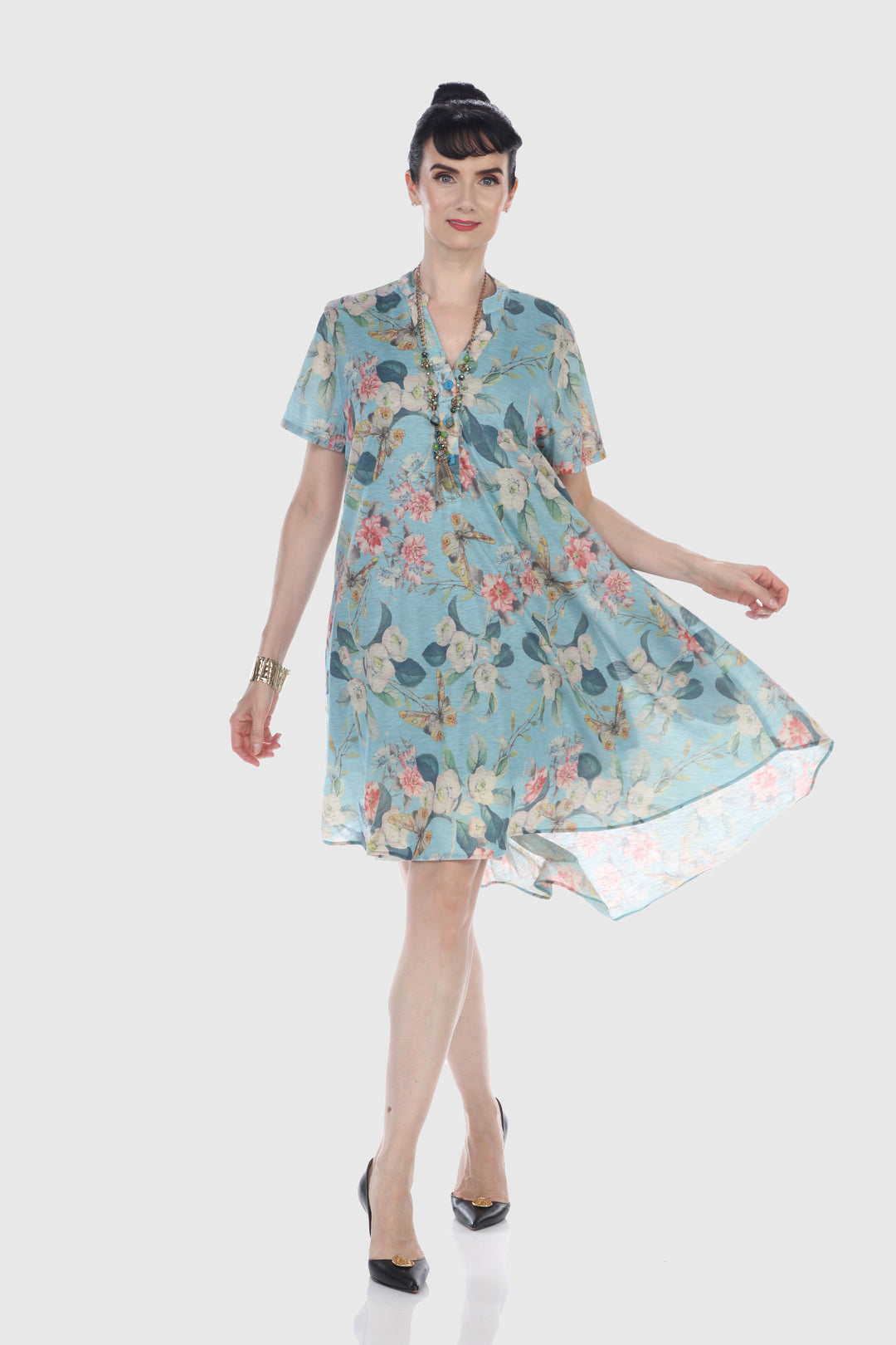 The Blue Blossom Breeze Dress is a mid-length floral dress made from 100% polyester. Featuring a shawl collar, short sleeves, and round button details, this dress offers a feminine, chic look that’s easy to maintain with machine wash in cold water.