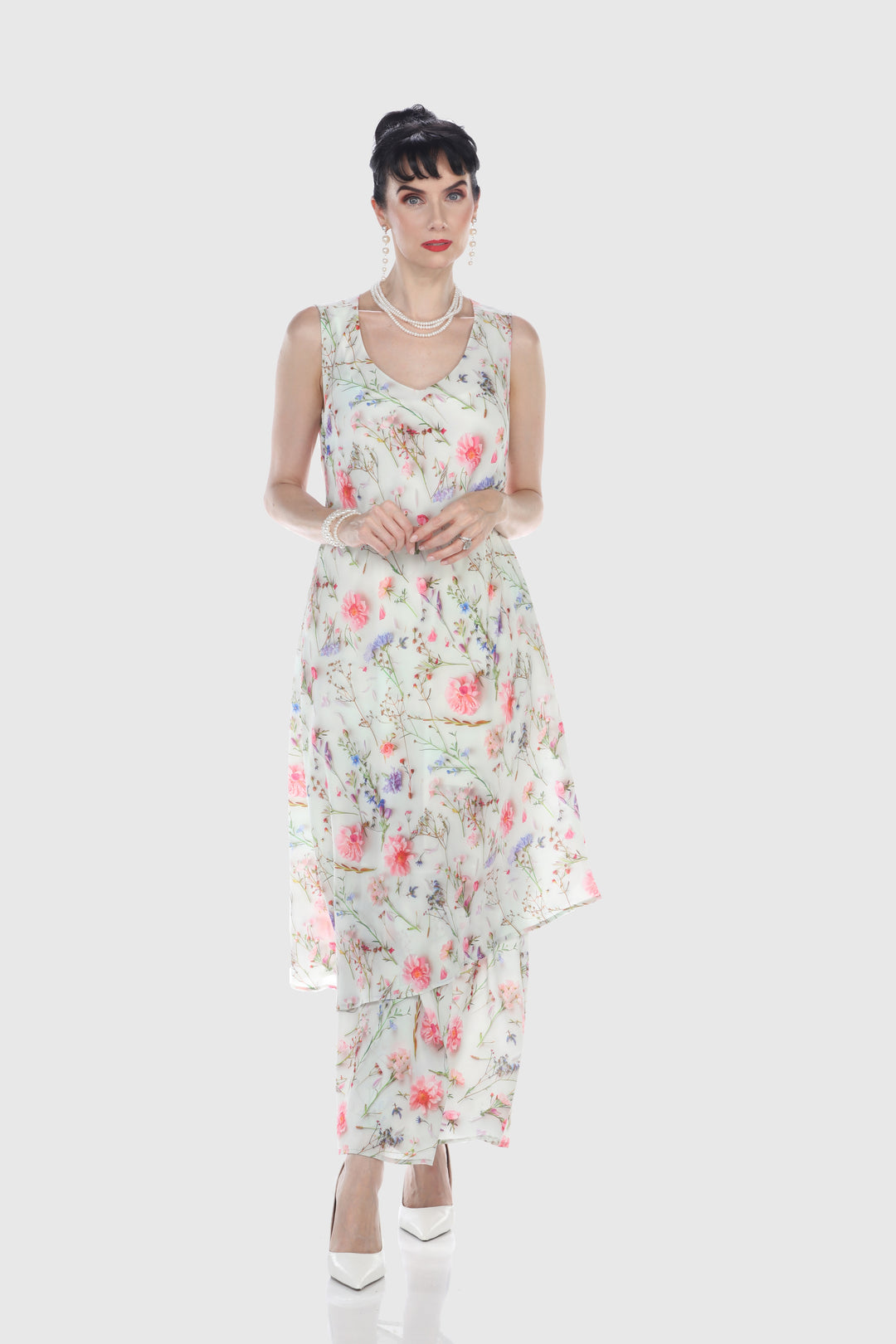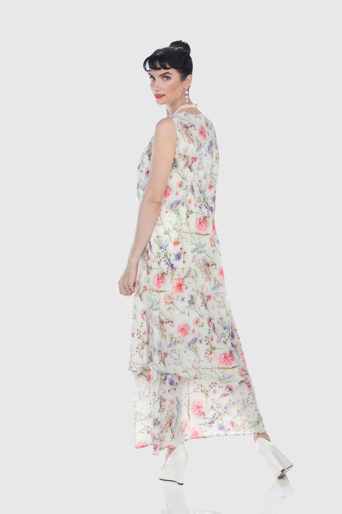 The Wildflower Breeze Layered Maxi Dress is a floral sleeveless dress made from 100% polyester. With a round neck and layered design, this long maxi dress is perfect for warm weather. It’s machine washable in cold water for easy care, offering both style and comfort.