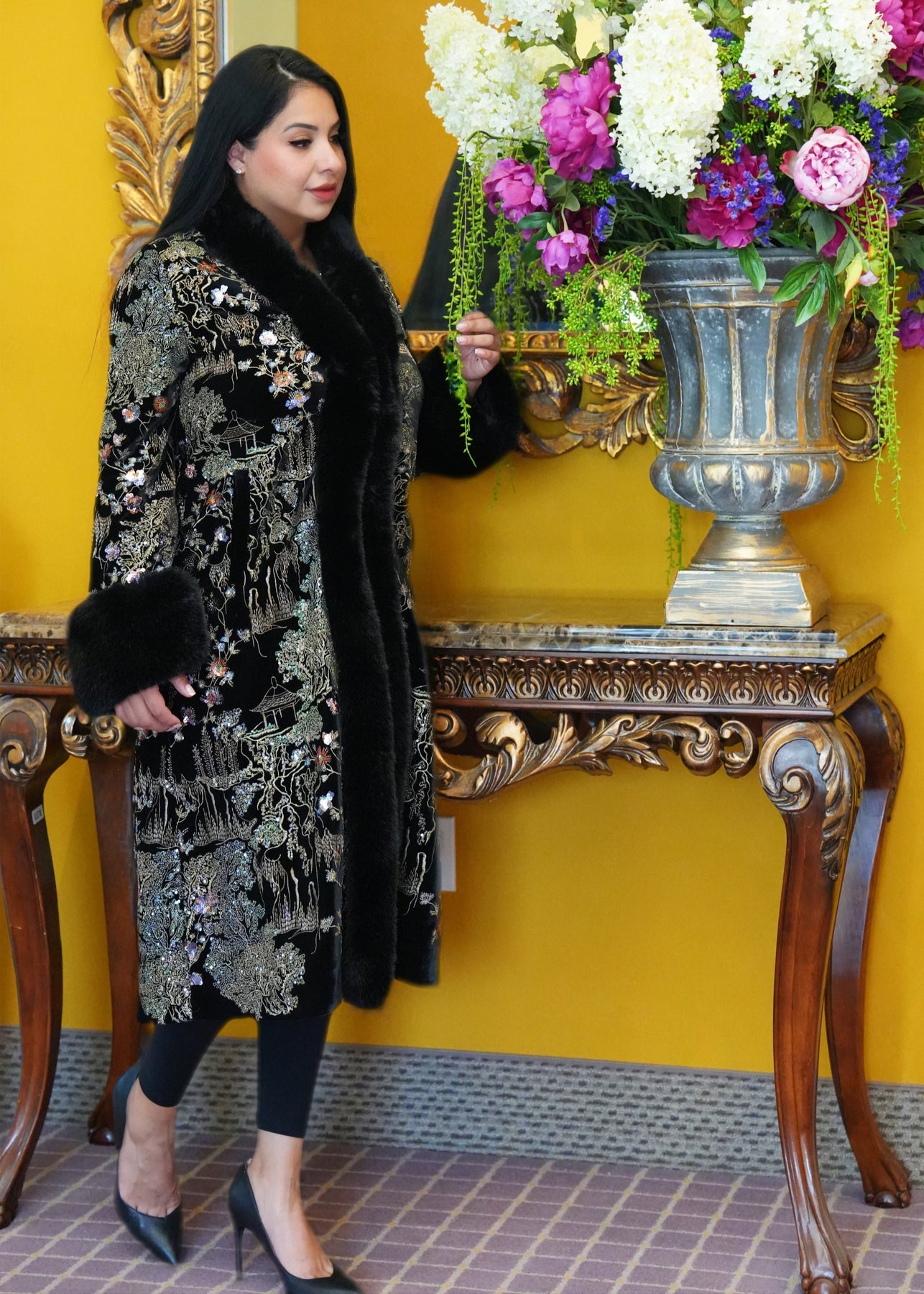 The Velvet Embroidered Coat combines luxurious velvet fabric with intricate oriental-inspired embroidery and faux fur trim for an elegant look. Crafted from 90% polyester and 10% spandex, it features a hook-and-eye closure, long sleeves, and a shawl collar for a sophisticated fit. This jacket is hand wash only, with no bleach or heat drying required, ensuring both style and easy maintenance.