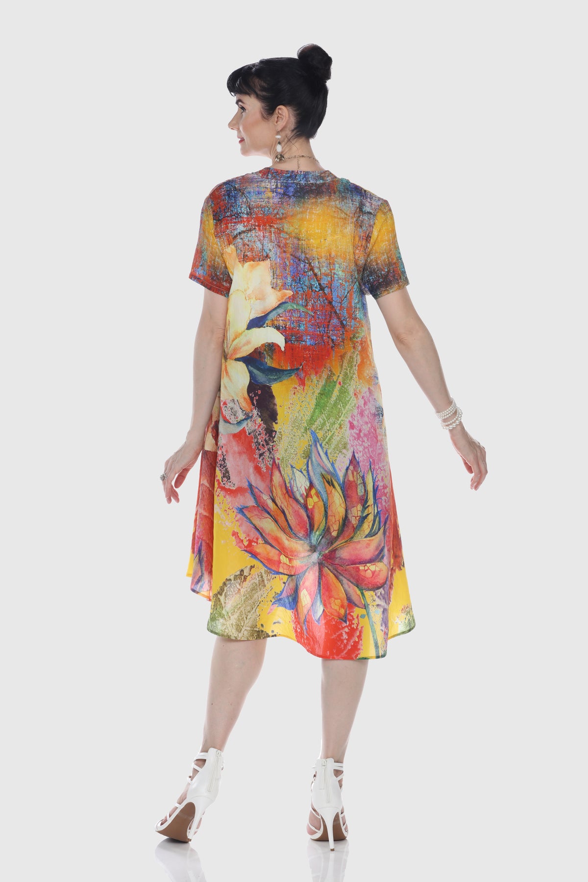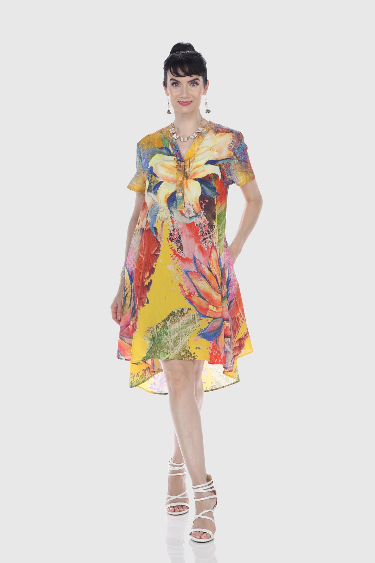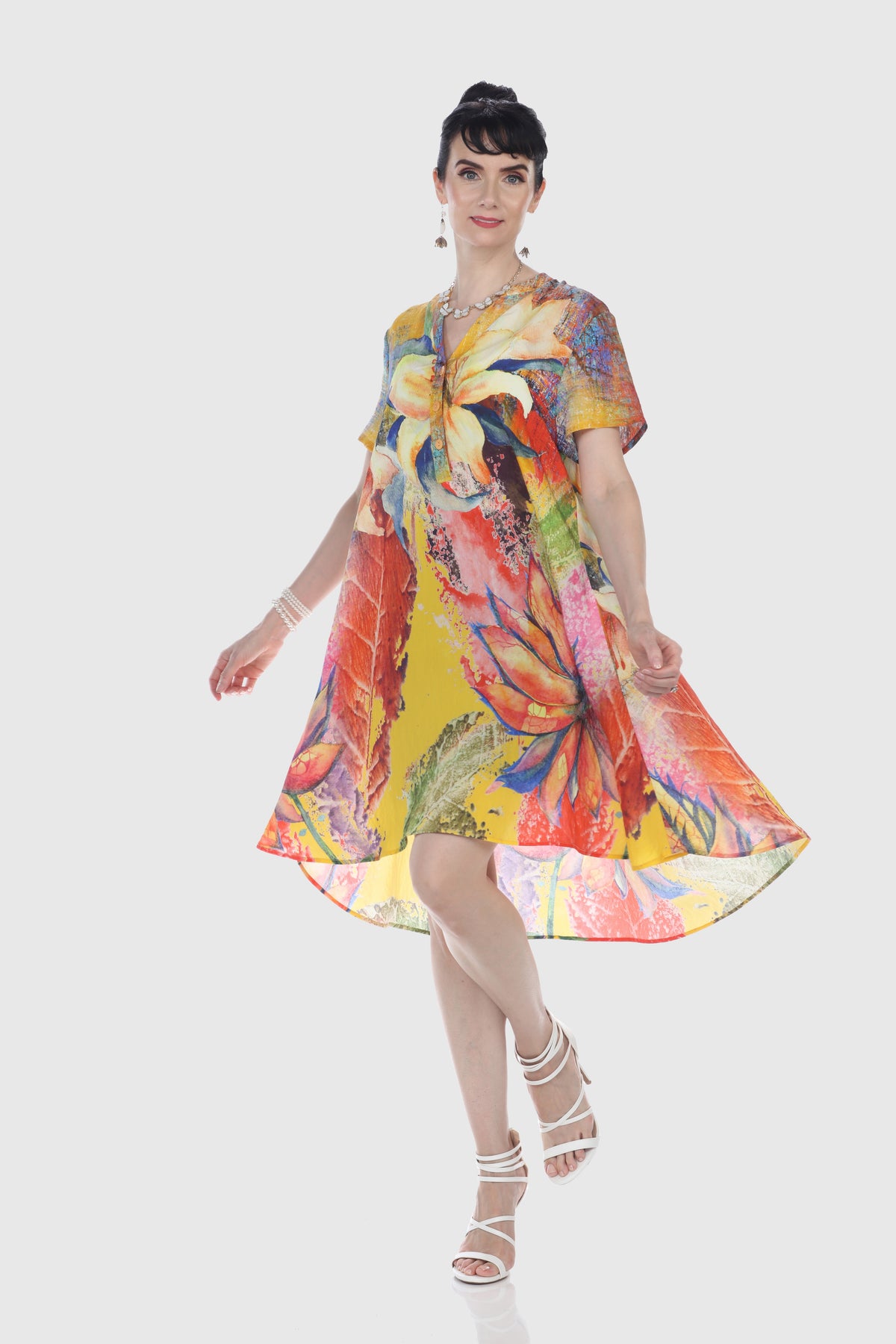 The Sunburst Garden Print Dress is a vibrant, mid-length dress crafted from a breathable rayon-nylon blend. Featuring a tropical floral print, it has short sleeves, a shawl collar, and round button details for a relaxed yet elegant silhouette. Lightweight and easy to care for, this dress is machine washable in cold water—perfect for sunny days and resort getaways.