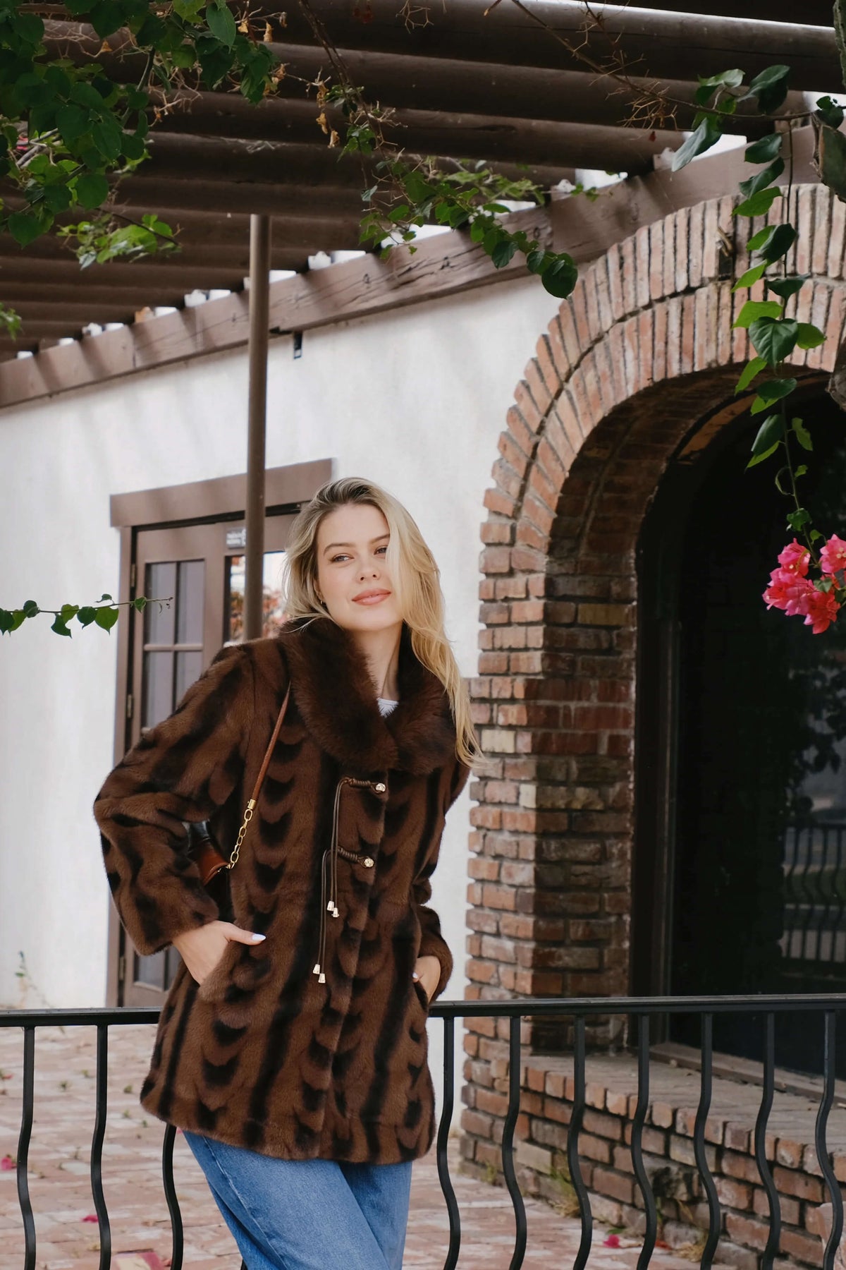 This mid-length faux fur jacket is made of 100% polyester, featuring a simple design with long sleeves and a shawl collar. It is dry clean only, with no beads or embroidery, and showcases an animal print pattern. The faux fur material adds warmth and style.