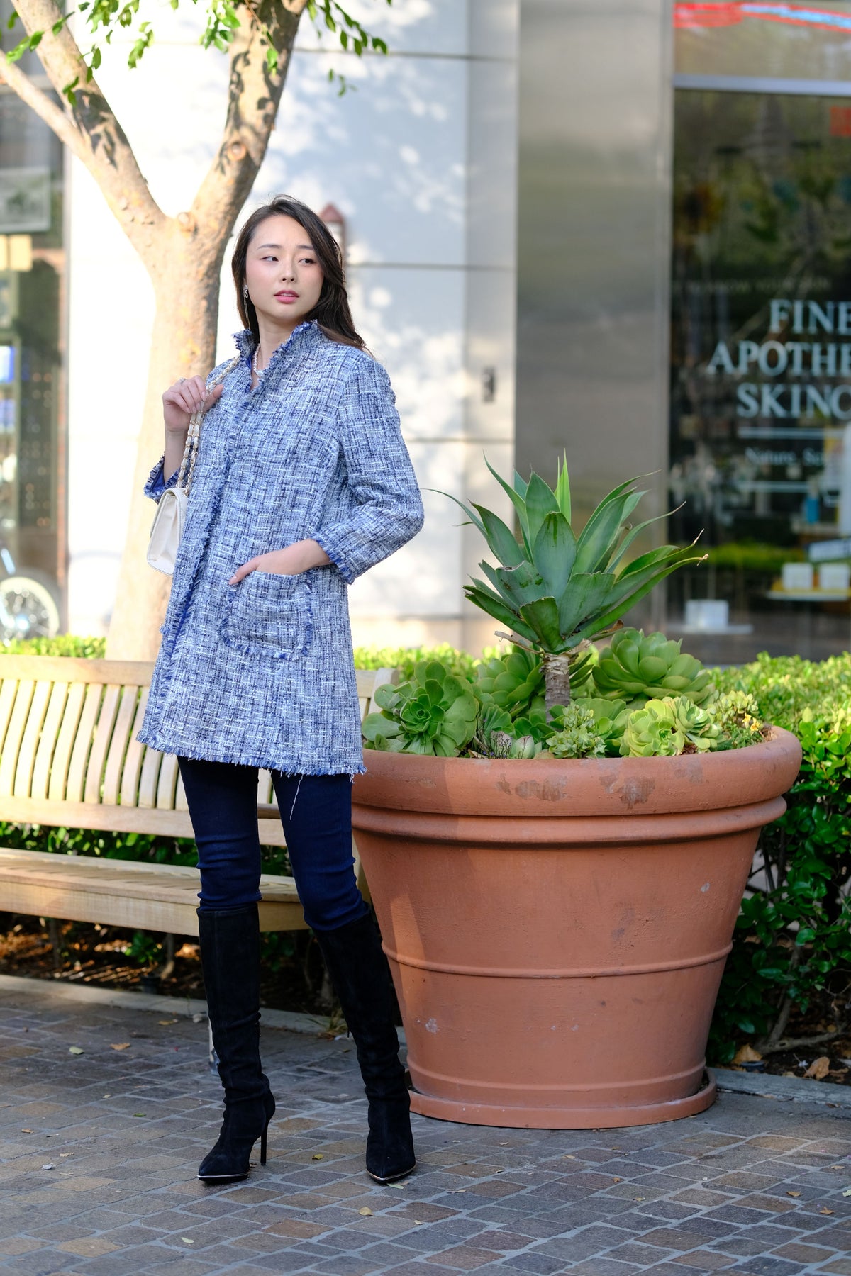 The Classic Tweed Long Jacket is a sophisticated, mid-length blazer made from 100% polyester woven fabric. Featuring a round collar, full-length sleeves, and a hook-and-eye closure, this jacket combines timeless tweed style with modern comfort. It's machine washable in cold water, ensuring easy care while maintaining its classic look.
