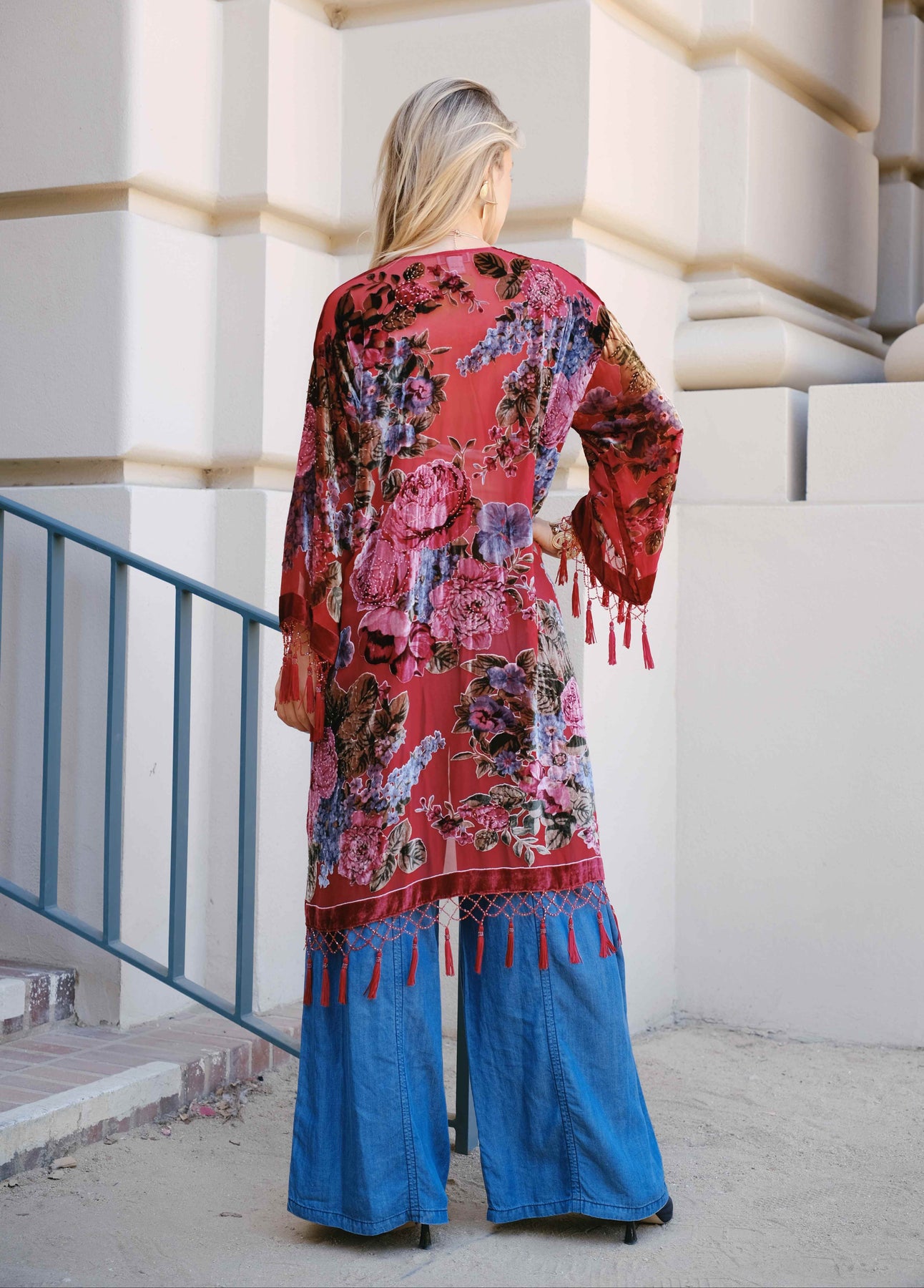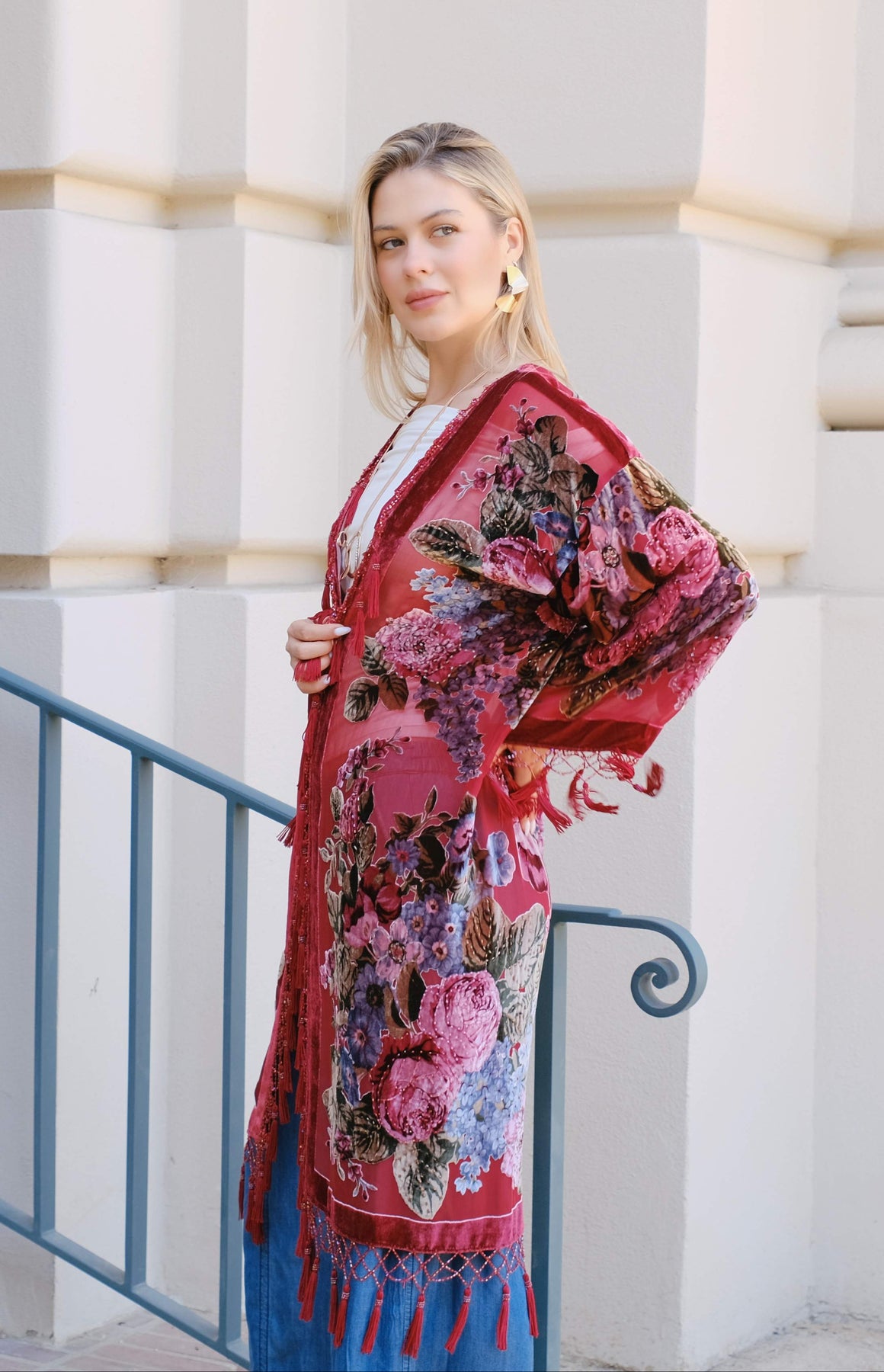 The Bgdy Floral Silk Velvet Kimono is a luxurious piece made from 70% silk and 30% rayon velvet. Featuring a floral pattern and beaded accents, this long kimono has full-length sleeves and a round neck. Hand wash in cold water for easy care.