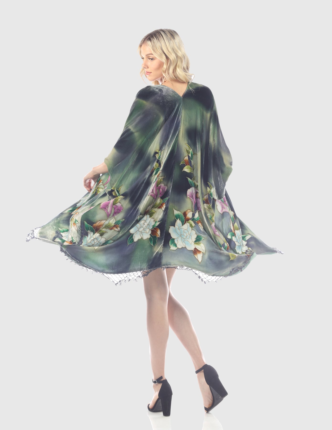 The Floral Long Velvet Ruana is an elegant accessory made from 70% silk and 30% rayon velvet. Featuring a floral pattern and beaded details, this long, sleeveless ruana has a stylish shawl collar. It’s machine washable in cold water, offering both luxury and practicality.