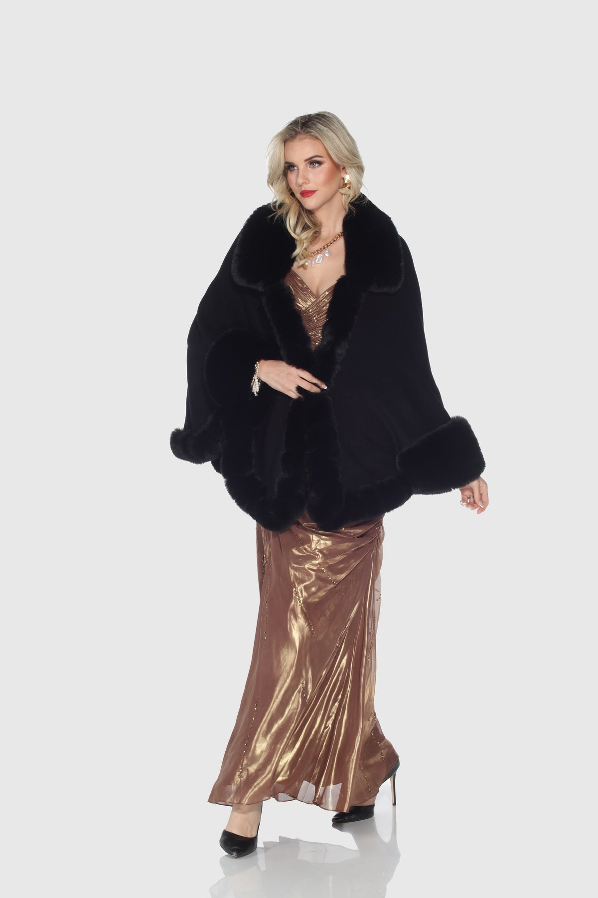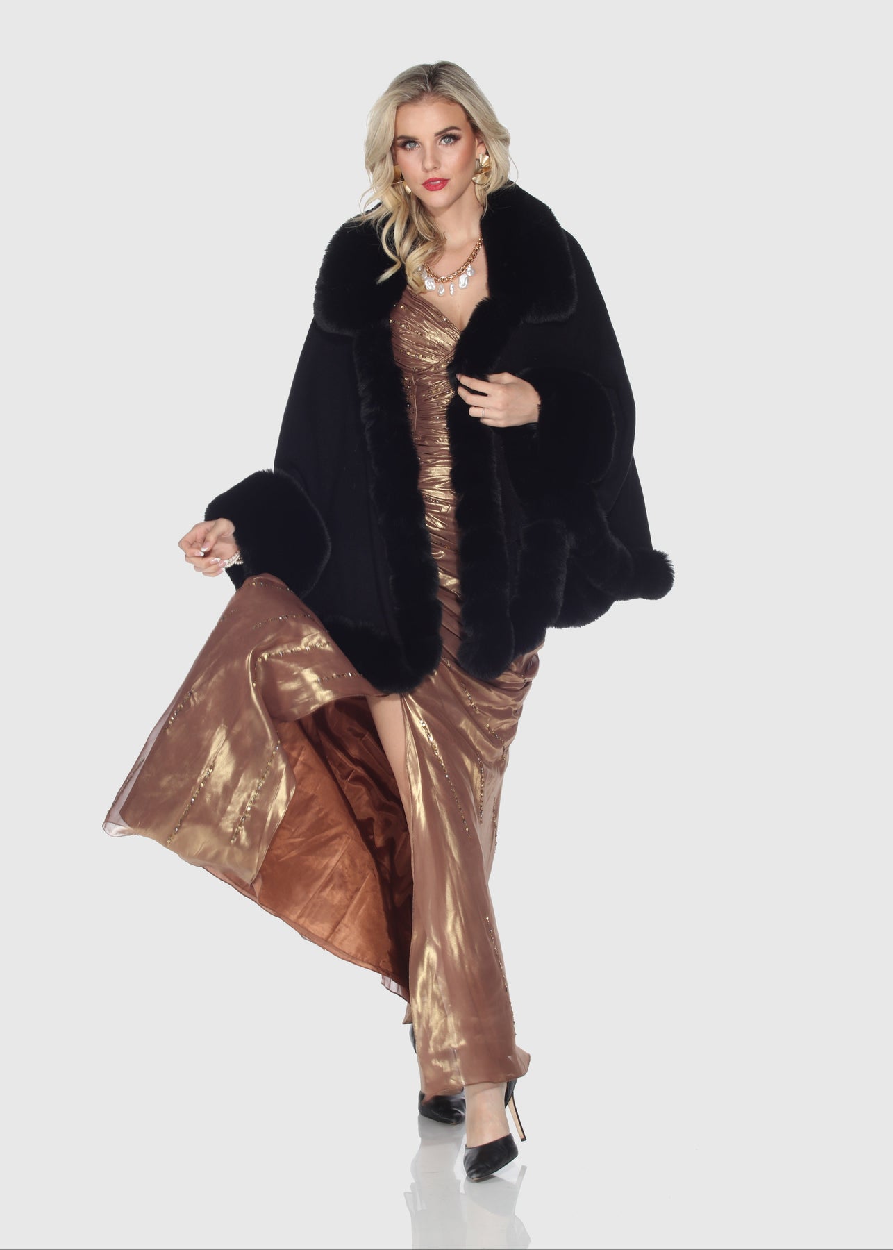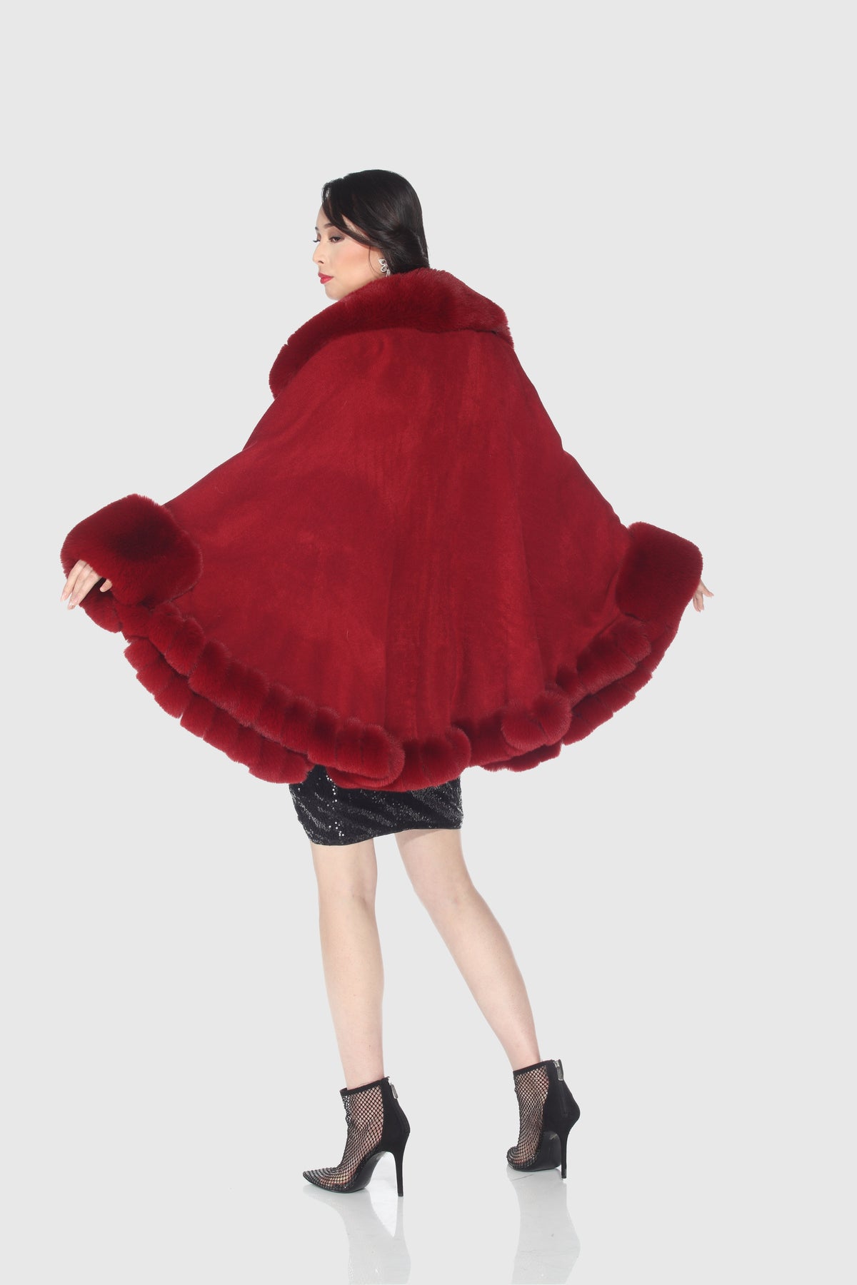 The Faux Fur Trim Poncho Cape is a stylish, mid-length piece made from soft acrylic with a luxurious faux fur trim. Its round collar and sleeveless design offer a chic, timeless look, perfect for adding warmth and elegance to any outfit.