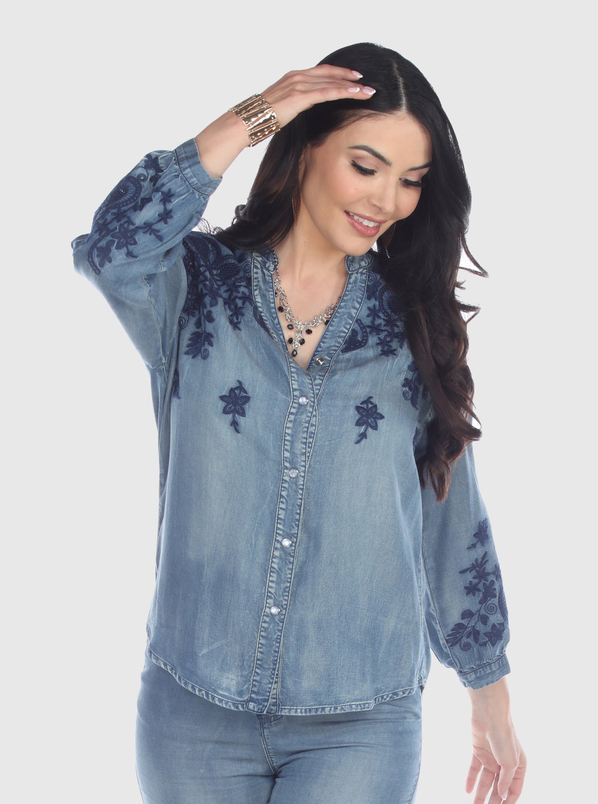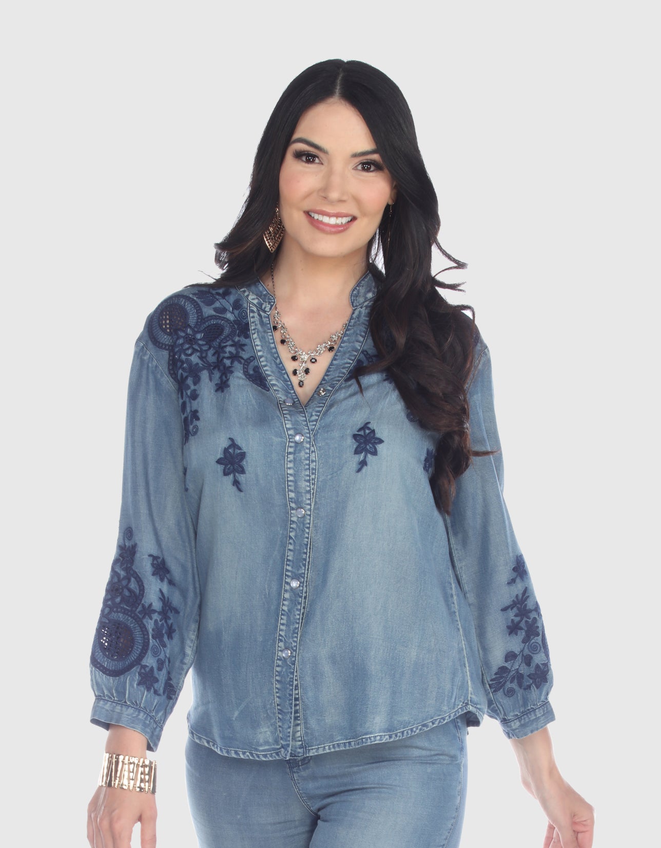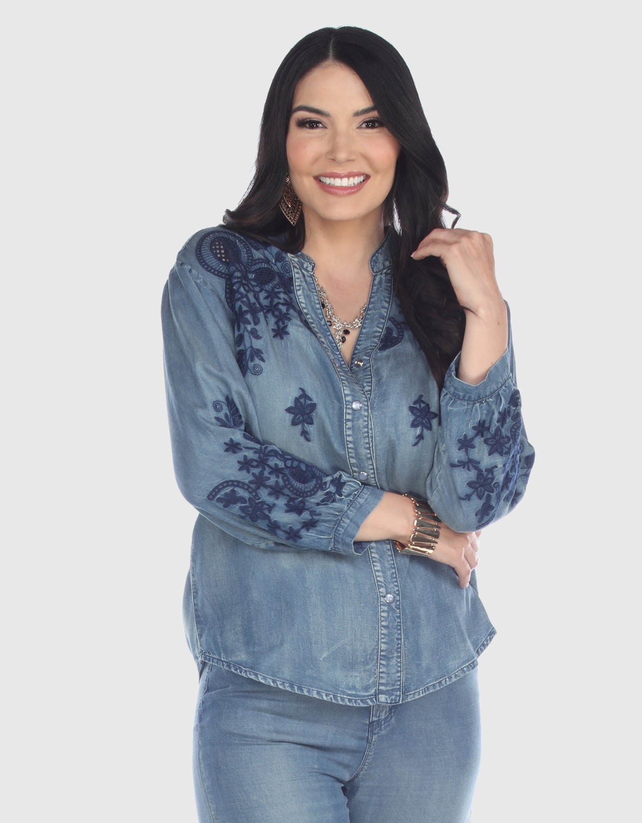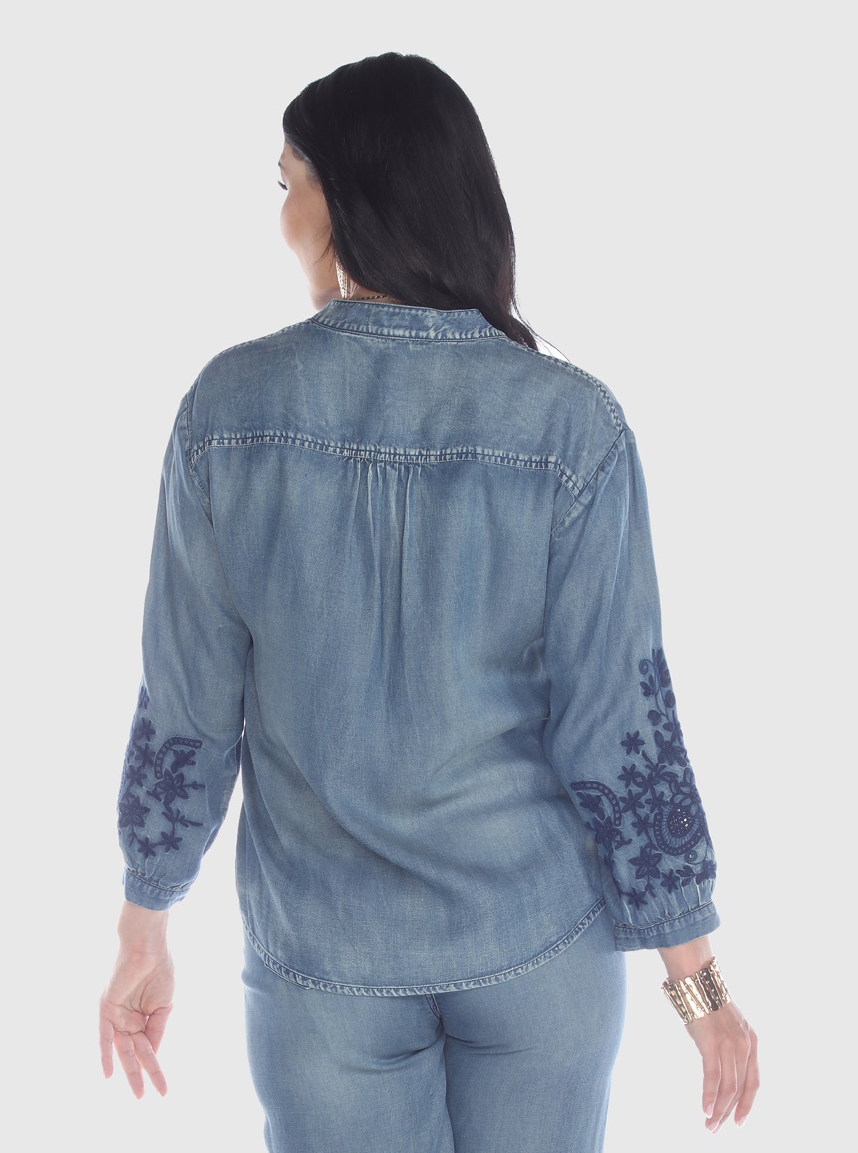 The Lyocell Flower Short Blouse combines soft comfort with delicate embroidered charm. Crafted from a lyocell-cotton blend, it features floral embroidery, a shirt collar, and long sleeves for a refined yet casual look. Its short length makes it perfect for pairing with high-waisted pants or skirts. Machine wash cold for easy care.