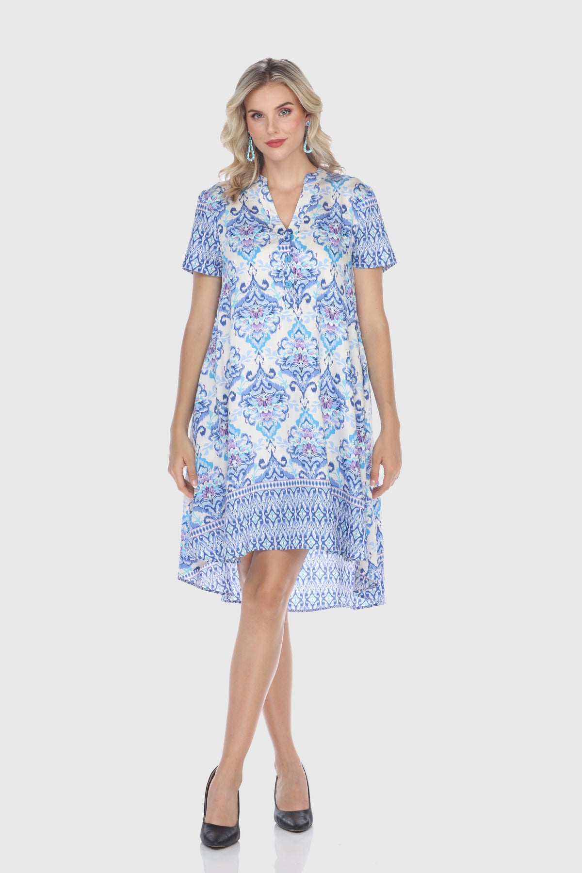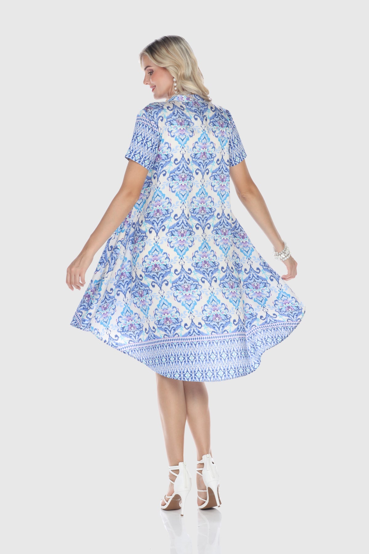 The Santorini Breeze Print Dress is a breezy, mid-length dress crafted from a soft rayon-nylon blend. Inspired by Mediterranean tiles, it features a shawl collar, short sleeves, and round button details that add an elegant touch. Lightweight and comfortable, this dress is machine washable in cold water—perfect for warm-weather days and resort-style elegance.