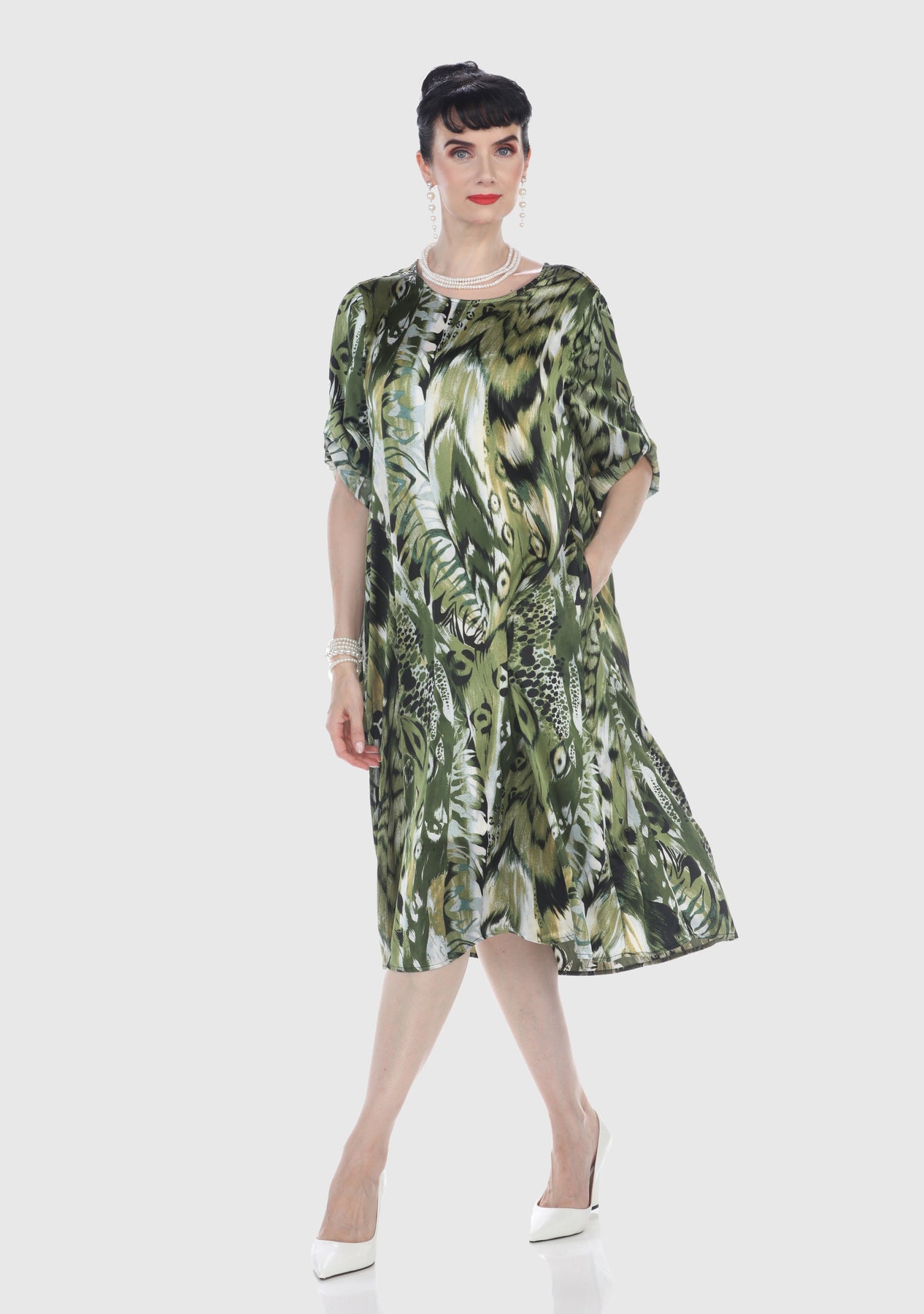 The A-Line Midi Dress with Sleeves is a 100% polyester dress featuring a round neck, 3/4 sleeves, and an animal print. Machine washable for easy care.