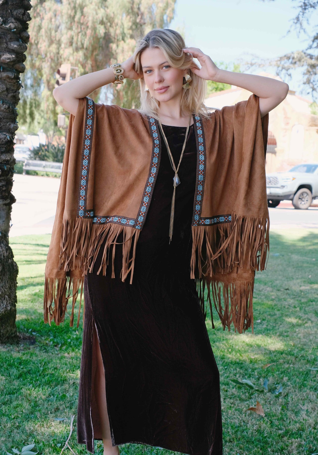 The Faux Suede Solid Poncho is a chic and versatile layering piece crafted from soft faux suede. Designed with a smooth solid finish, it features a short, open-front cut and subtle beaded detailing for a hint of texture. Lightweight and easy to pair, it complements both casual and elegant outfits. Machine wash cold for easy care.