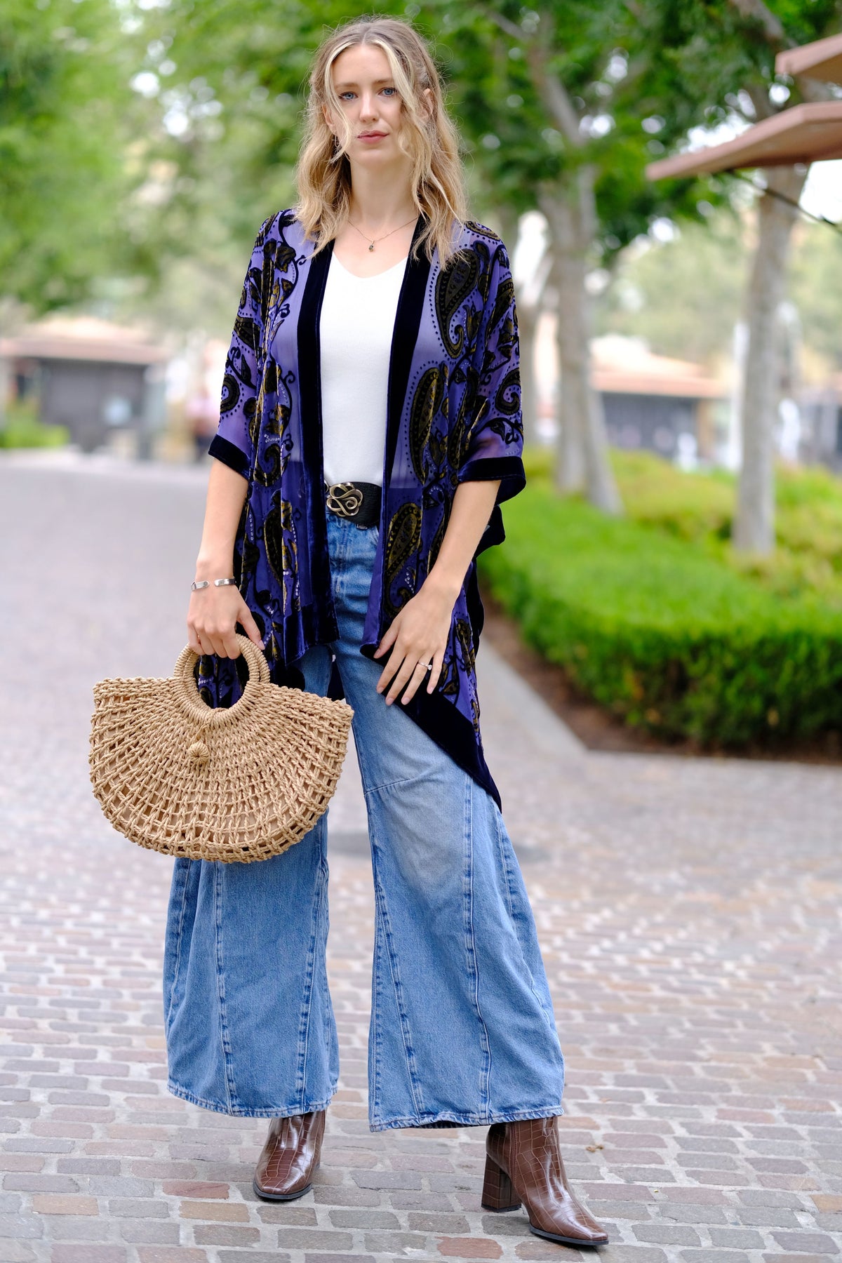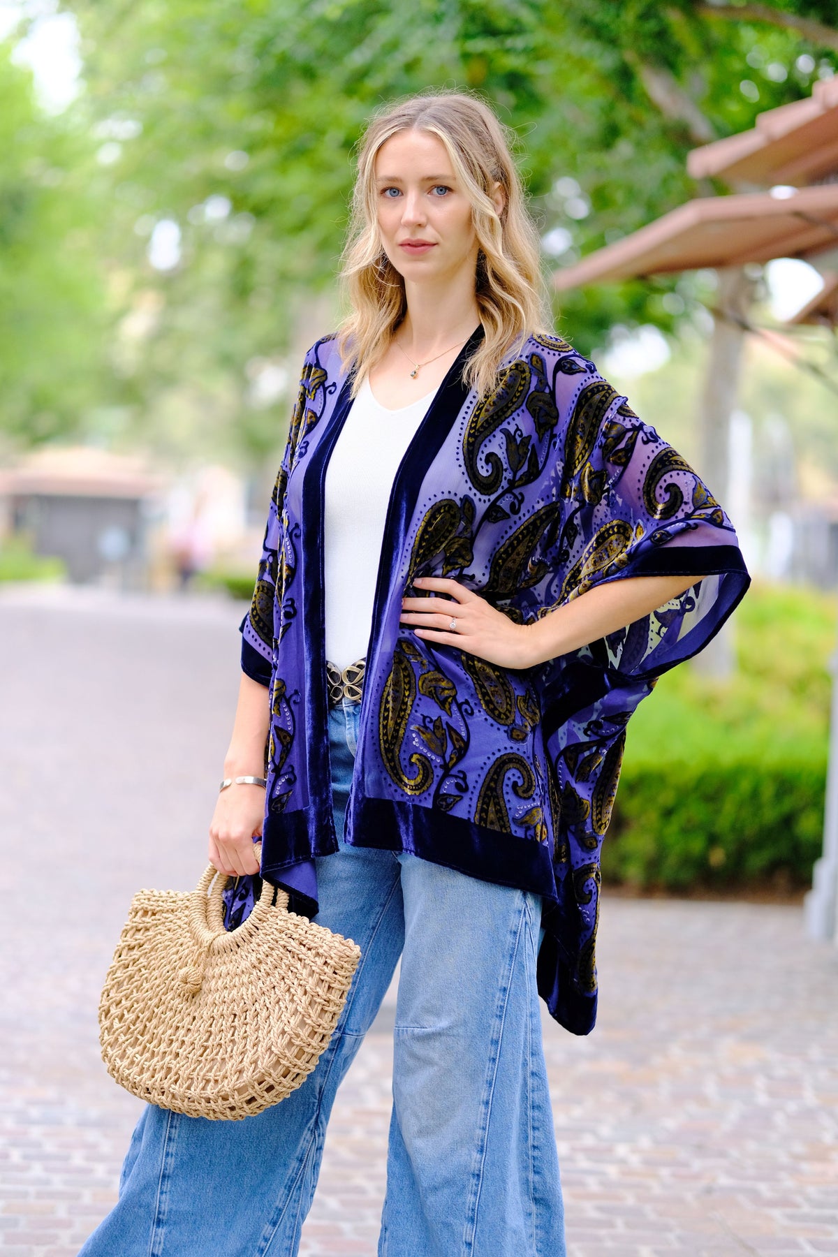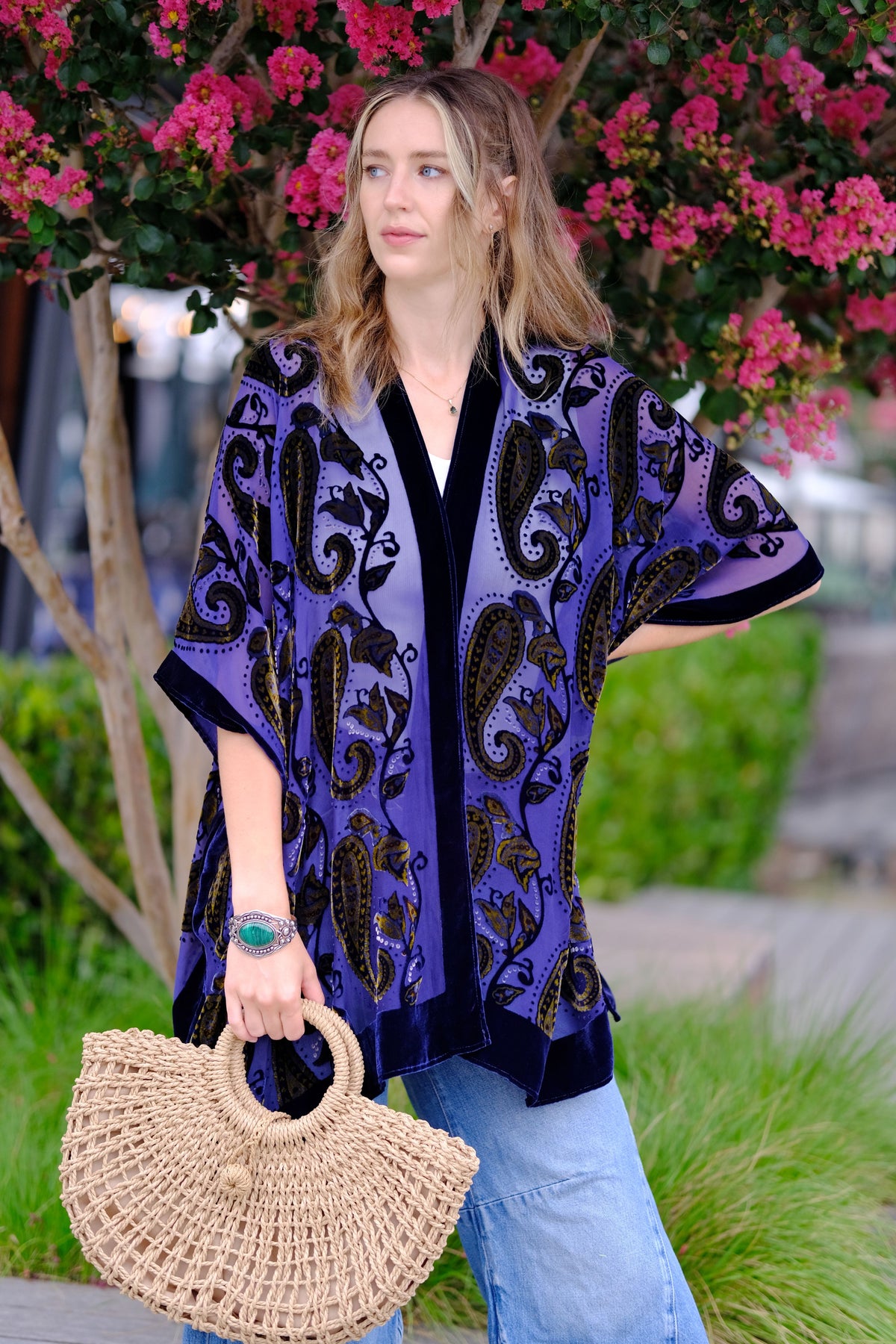 The Indigo Paisley Velvet Kimono is crafted from a rich blend of 70% silk and 30% rayon, creating a soft, plush velvet texture with an elegant drape. Its open-front design, 3/4 sleeves, and mid-length silhouette make it an effortless layer for calm evenings, relaxed gatherings, or moments when you want a touch of refined comfort. The paisley pattern adds depth and character, elevating every look. Hand wash cold; avoid bleach and ironing.