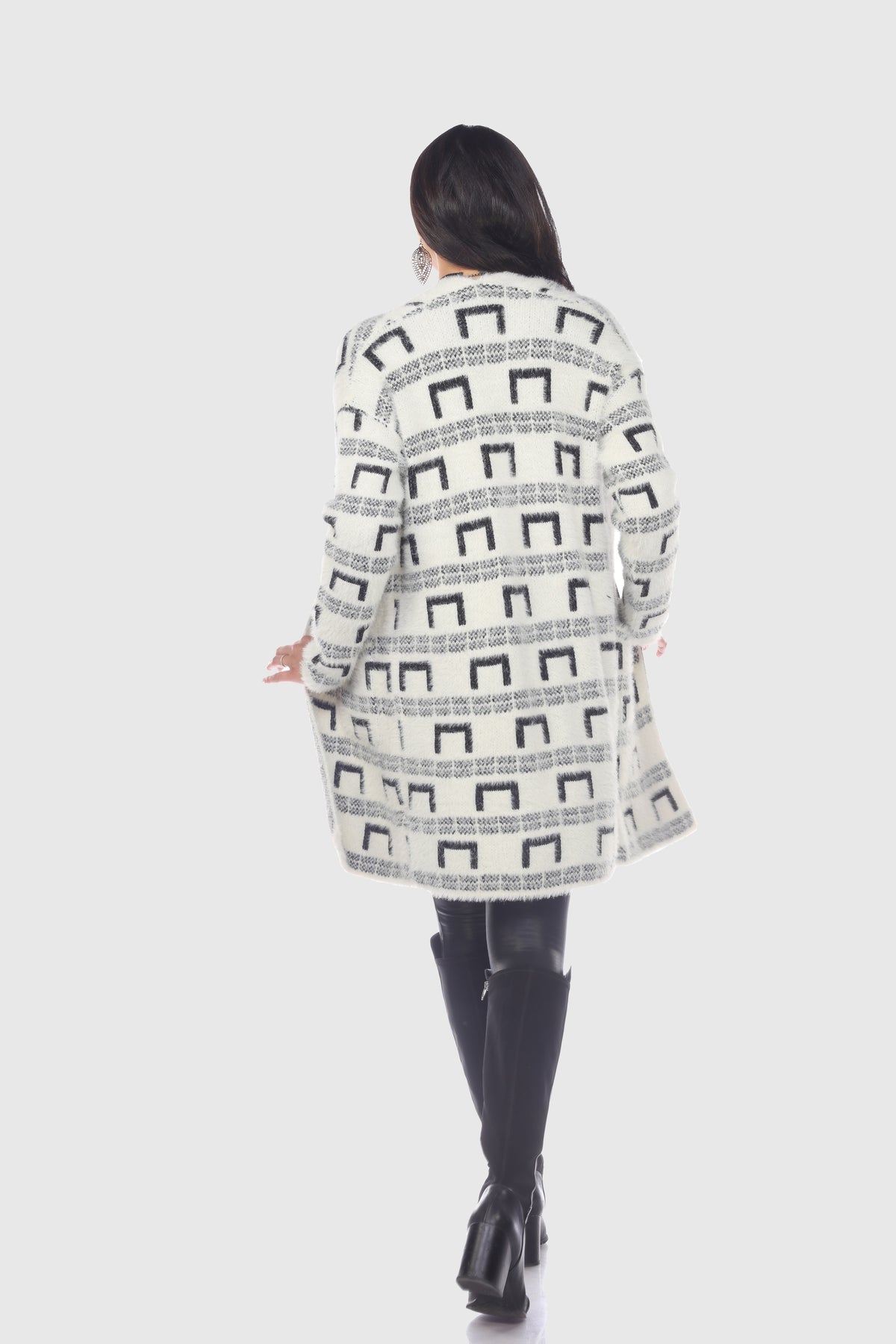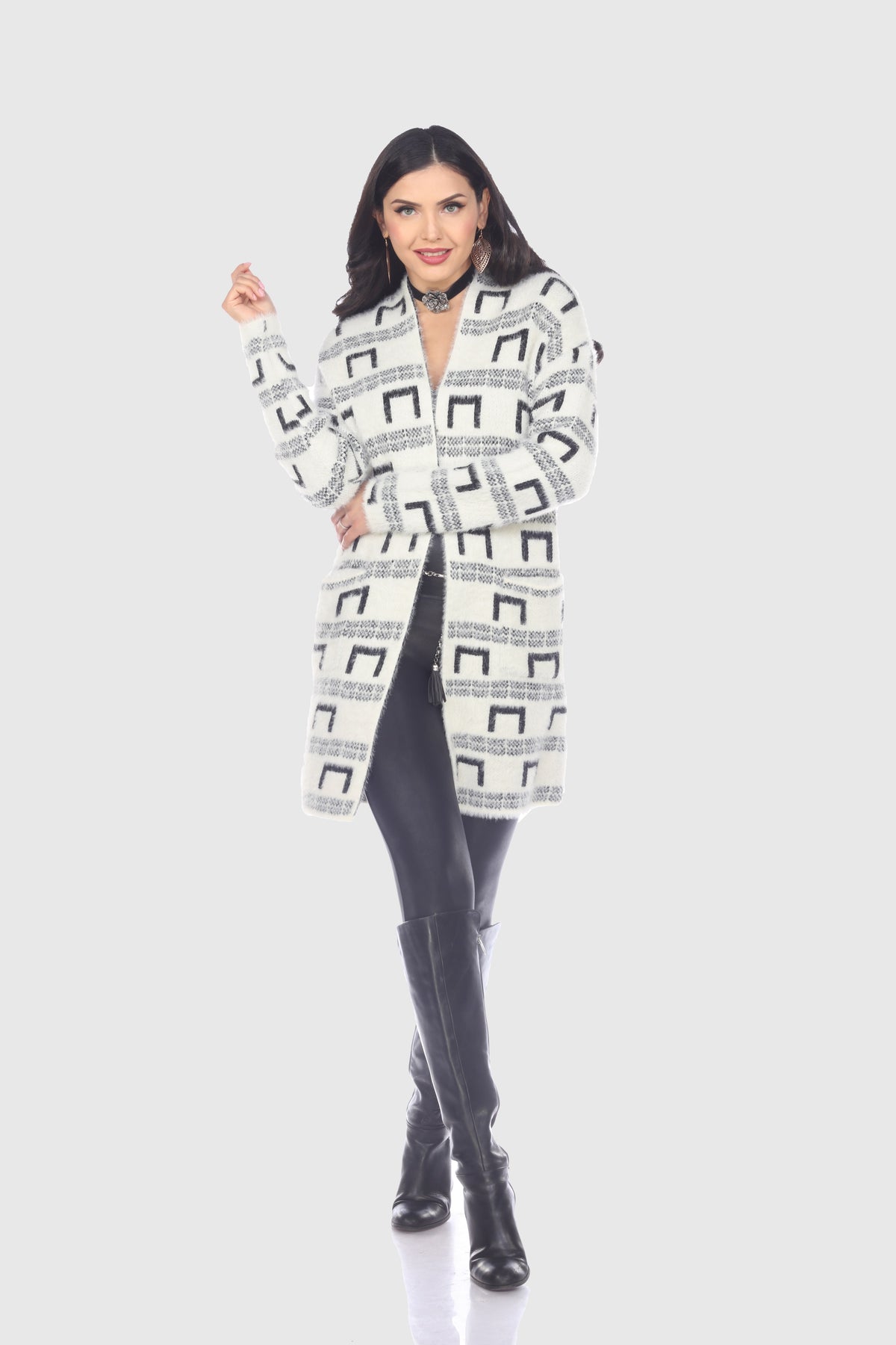 Designed with a mid-century modern aesthetic, this open-front cardigan features a soft faux fur trim for added warmth and refined style. Crafted from a comfortable acrylic-polyester blend, it offers a relaxed mid-length fit with long sleeves and a clean hook closure—perfect for effortless layering on cool days.