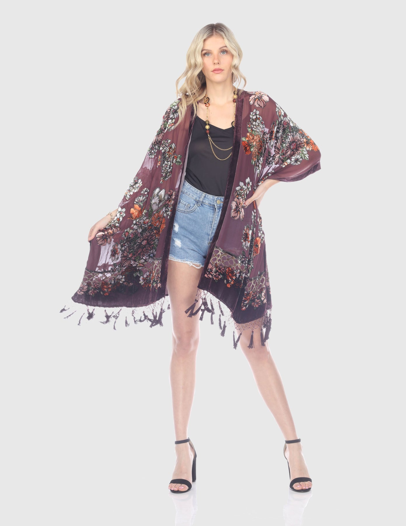 This long open-front ruana is crafted from luxurious silk velvet with a rich floral pattern and subtle beaded accents. The fluid drape and soft texture create an elegant statement, perfect for layering over evening looks or adding refinement to special occasions.