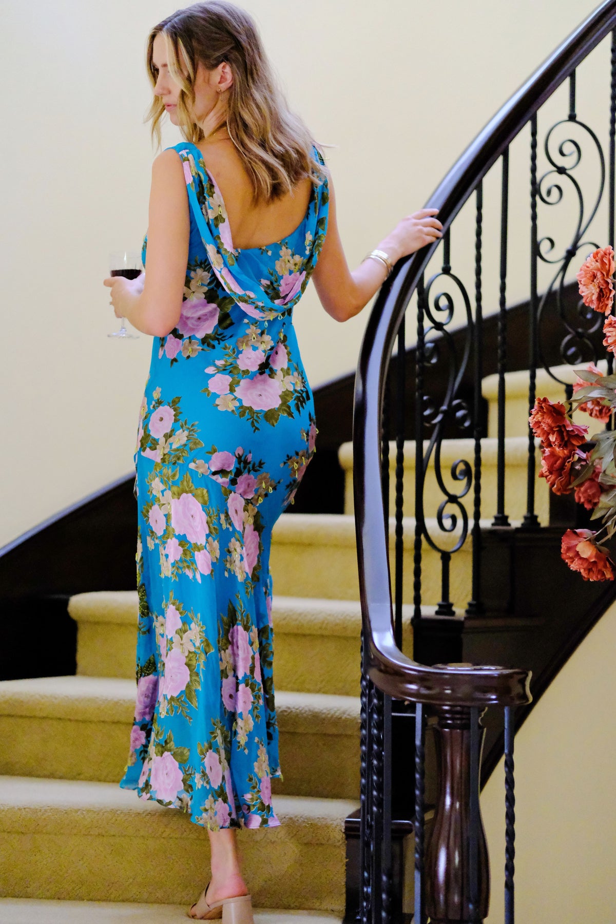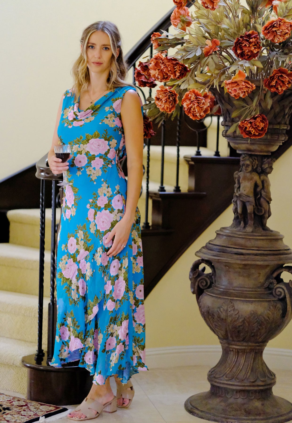The Garden Riviera Floral Slip Silk Dress by Aris A is crafted from 100% pure silk with a smooth, lightweight drape. Featuring a romantic floral print, shimmering bead accents, and a flattering cowl neckline, this long slip dress embodies effortless elegance. Perfect for summer parties, garden events, or resort escapes.