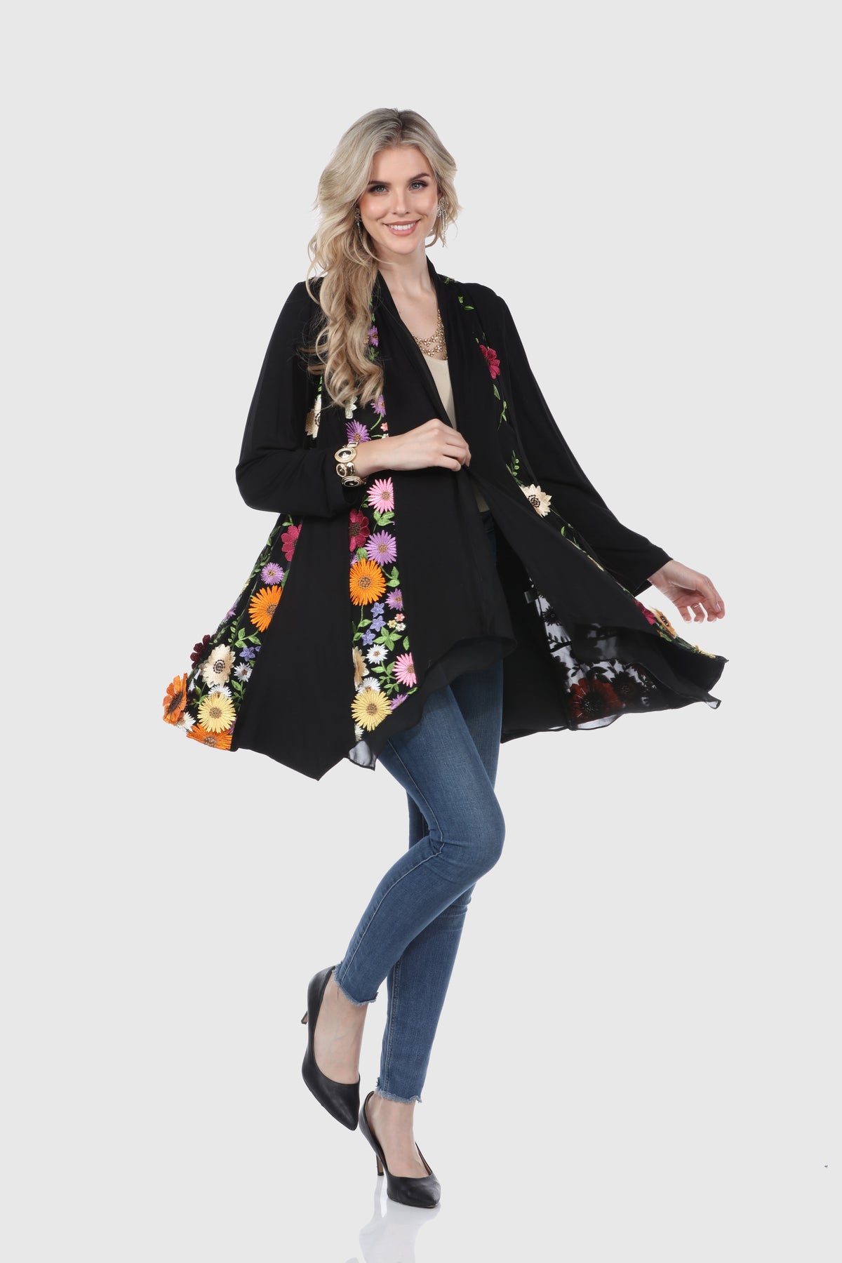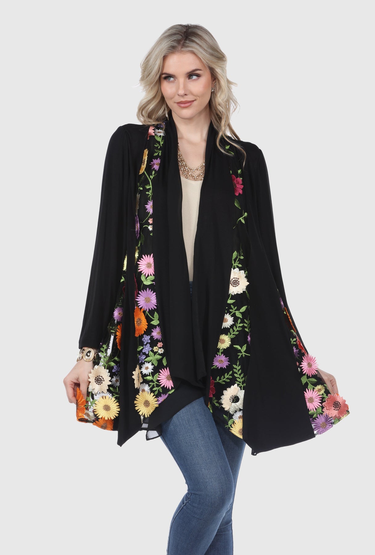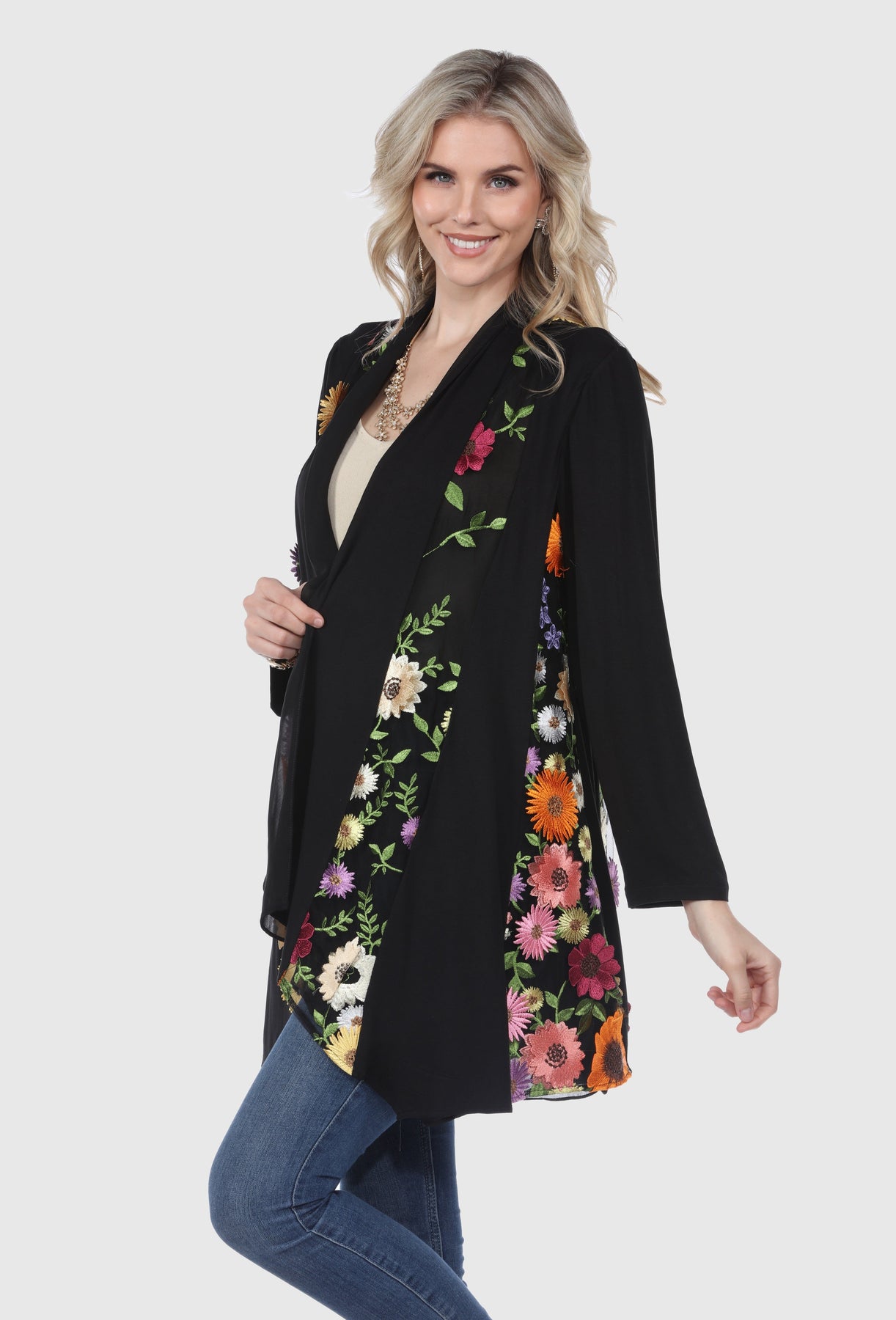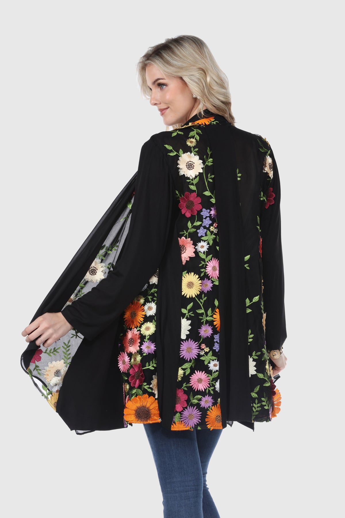 The Cardigan with 3D Floral Embroidery is a stylish and modern outerwear piece made from 90% polyester and 10% spandex embroidered mesh. Featuring intricate 3D floral embroidery, this mid-length cardigan offers full-length sleeves and an open front design. It's machine washable in cold water, ensuring easy care while maintaining its delicate embroidered details.