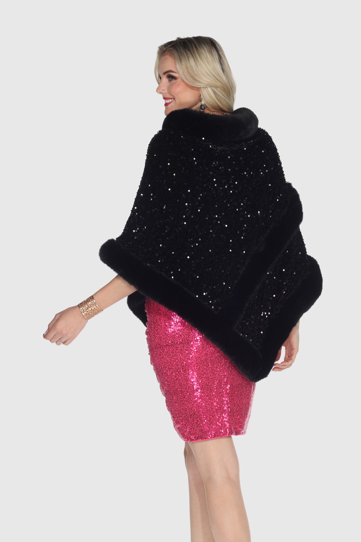 The Black Velvet Sequin Poncho combines luxurious velvet fabric with dazzling sequins for a glamorous look. Its faux fur trim adds warmth, while the sleeveless, button-free design offers sleek, effortless style. Perfect for both evening wear and casual outfits.
