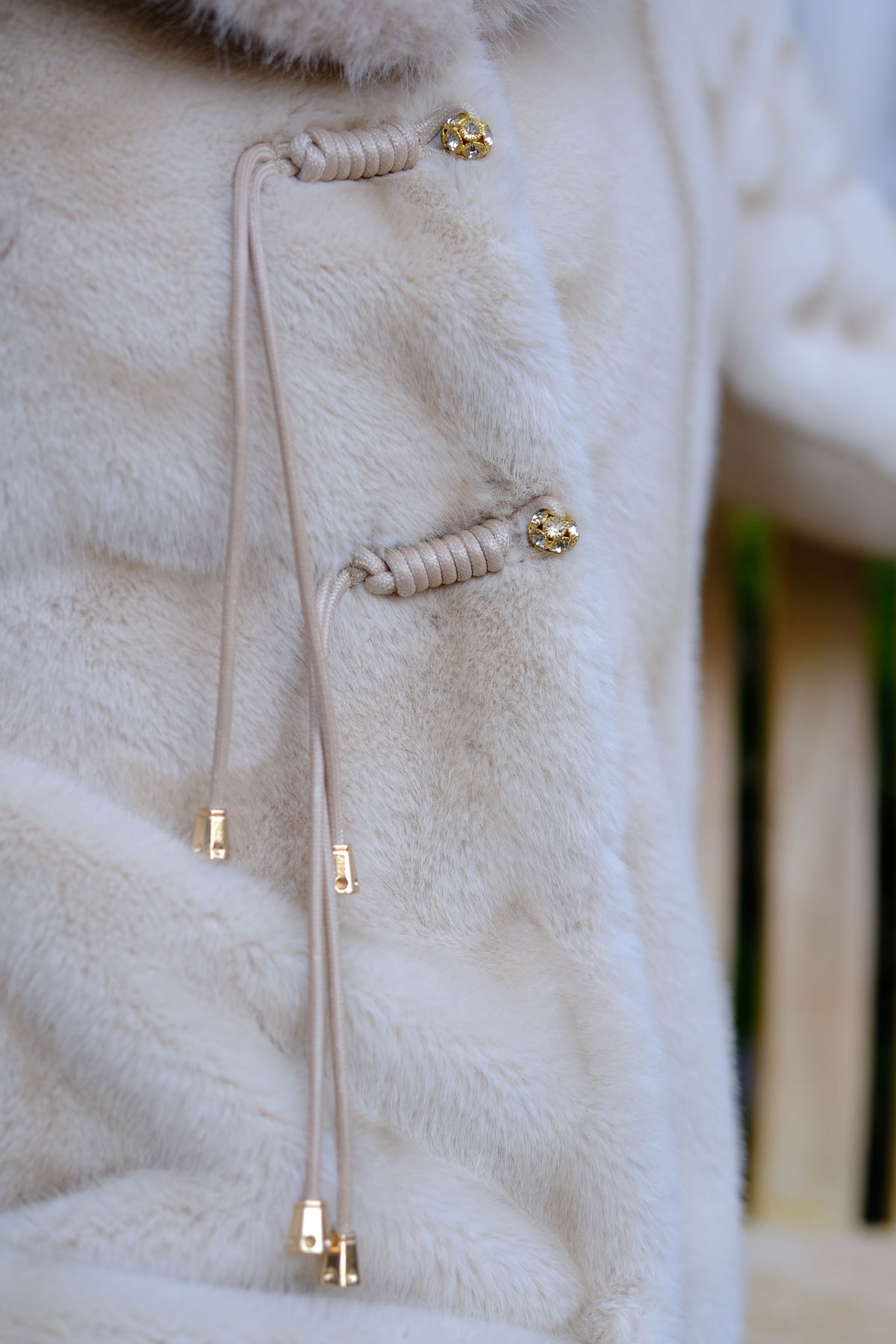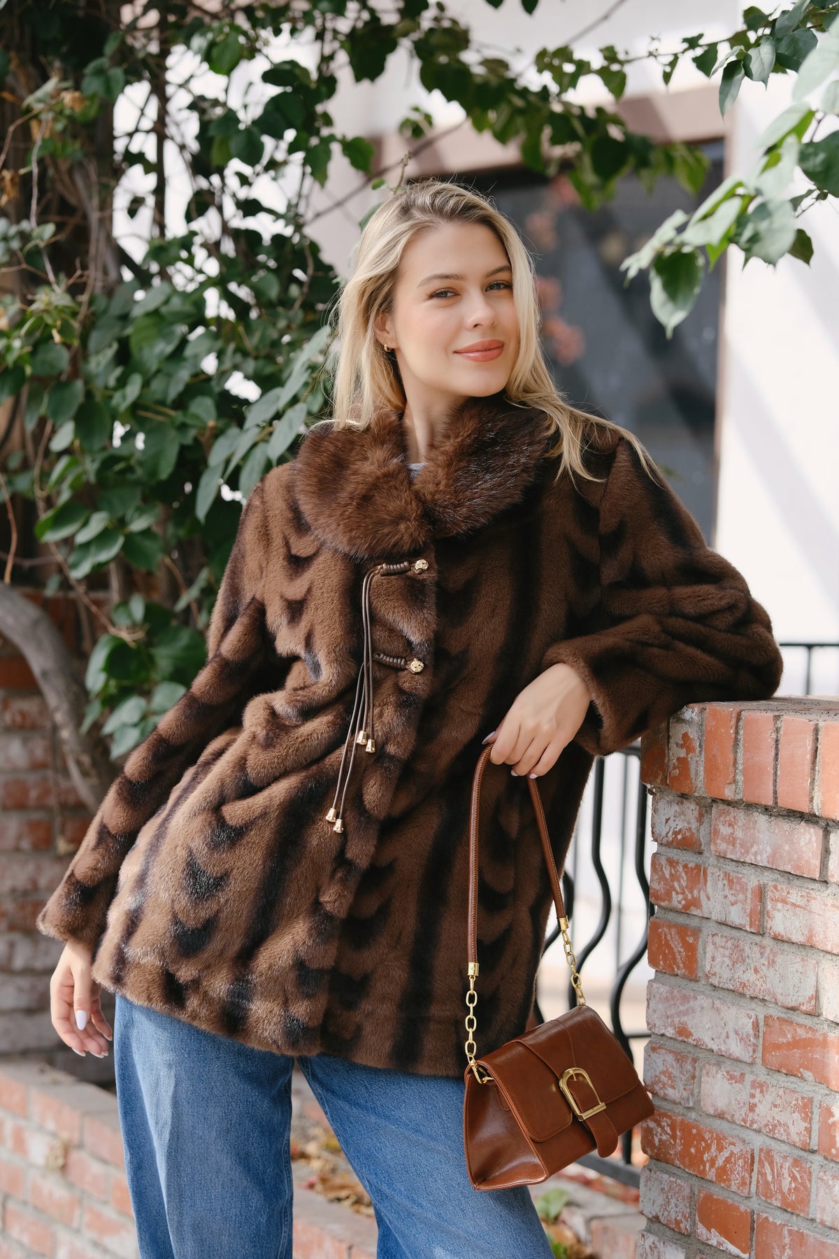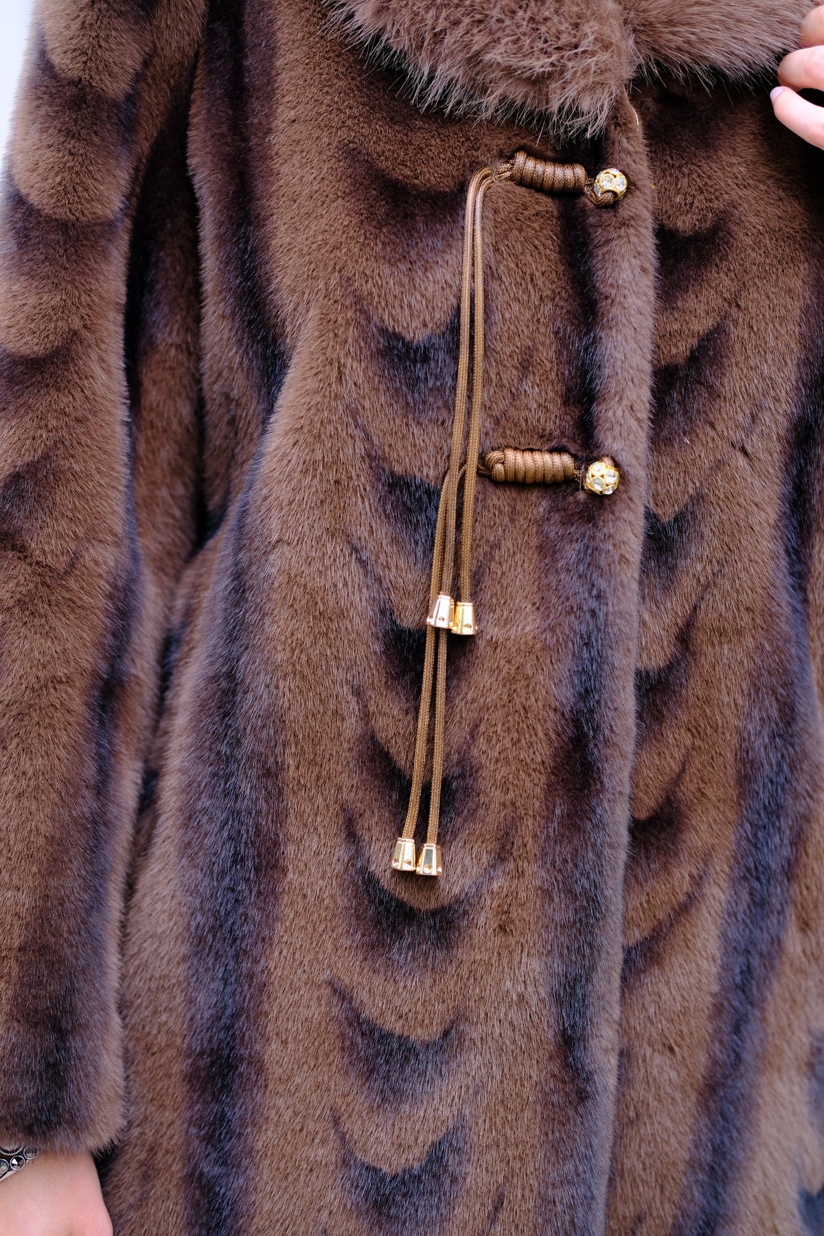 This mid-length faux fur jacket is made of 100% polyester, featuring a simple design with long sleeves and a shawl collar. It is dry clean only, with no beads or embroidery, and showcases an animal print pattern. The faux fur material adds warmth and style.