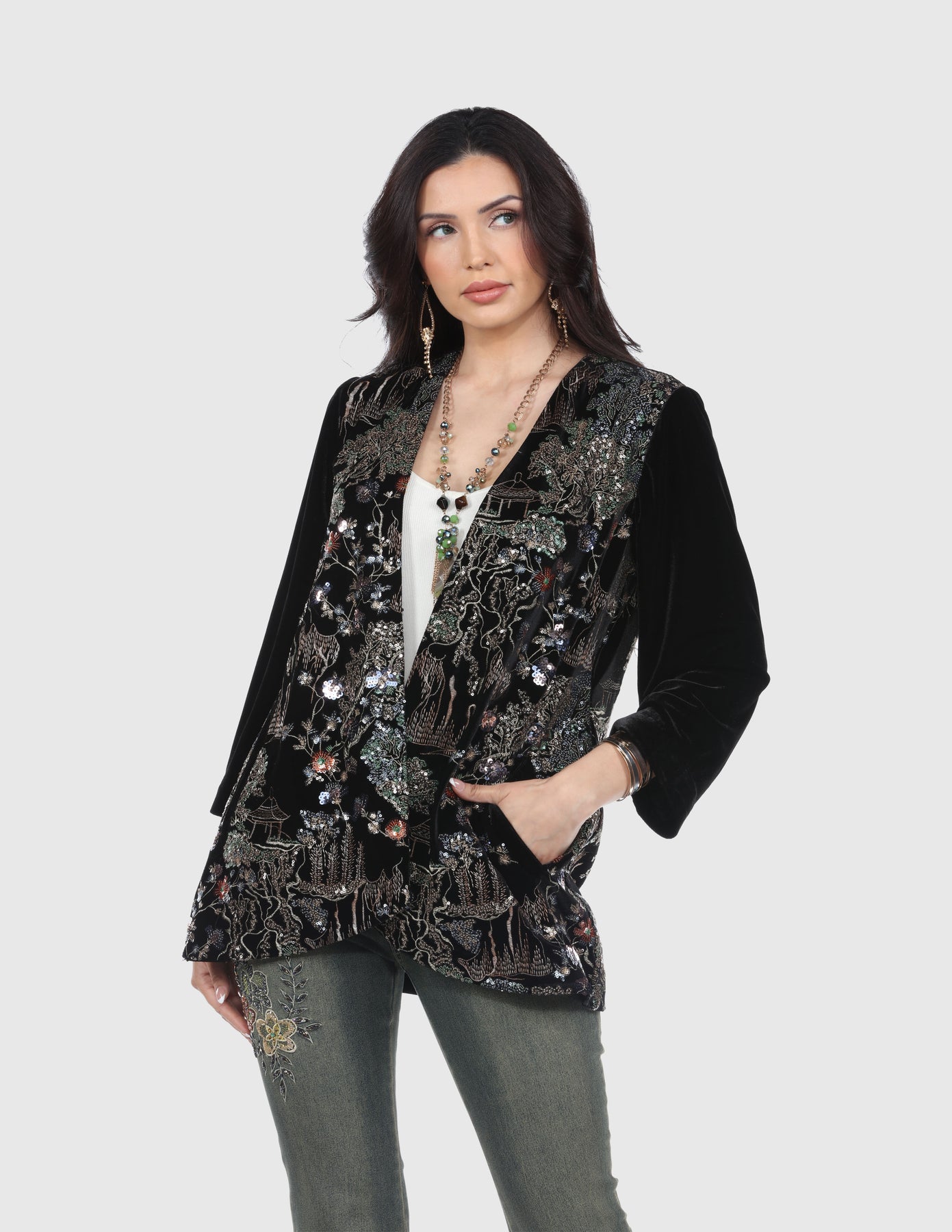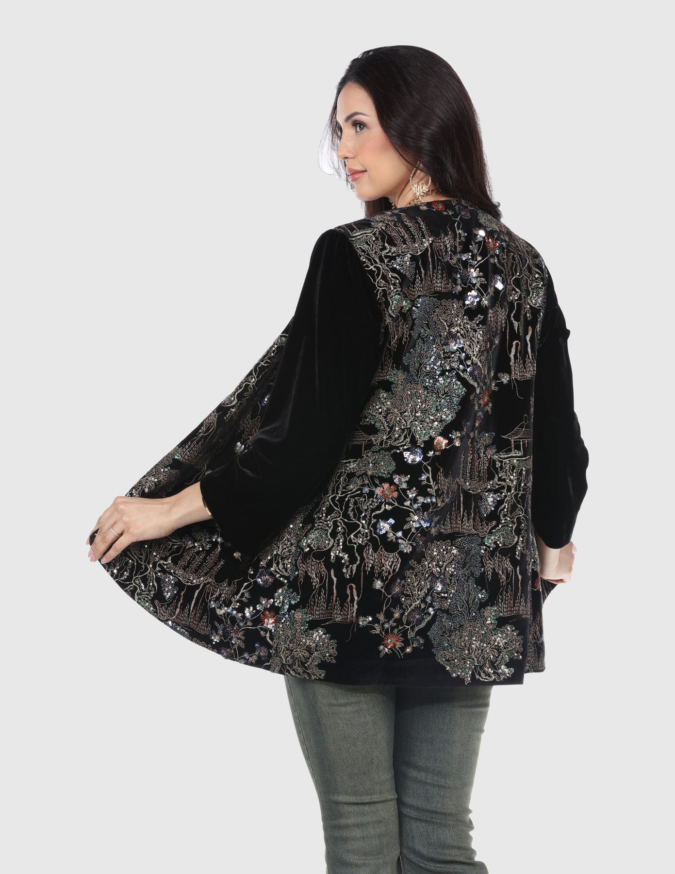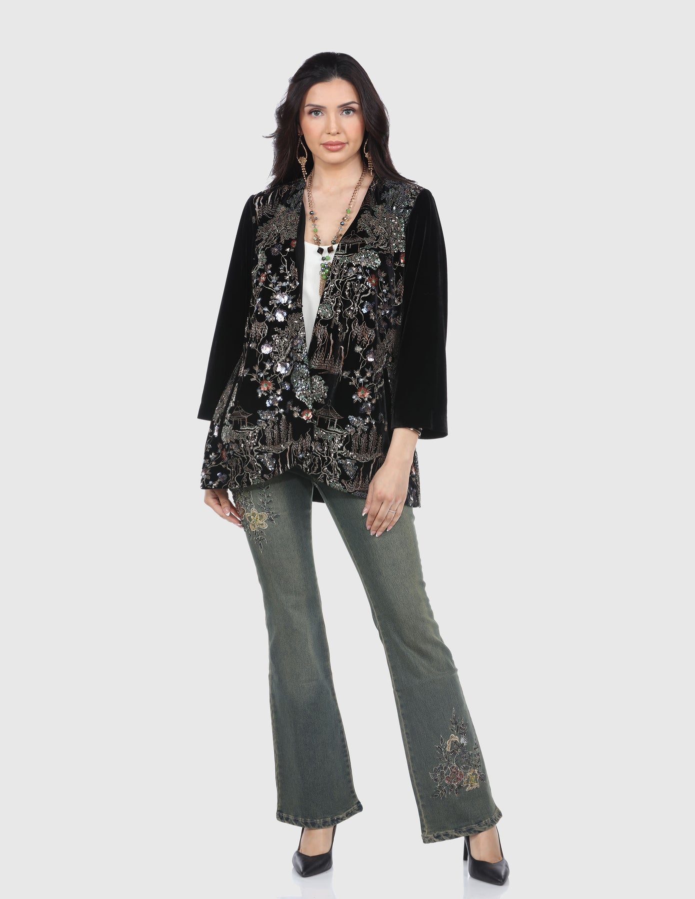 The Black Blouse features intricate Asian-inspired embroidery for a sophisticated touch. Crafted from 90% polyester and 10% spandex, it offers comfort and style with a hook-and-eye closure, long sleeves, and a shawl collar. This short blouse is hand wash only for easy care.
