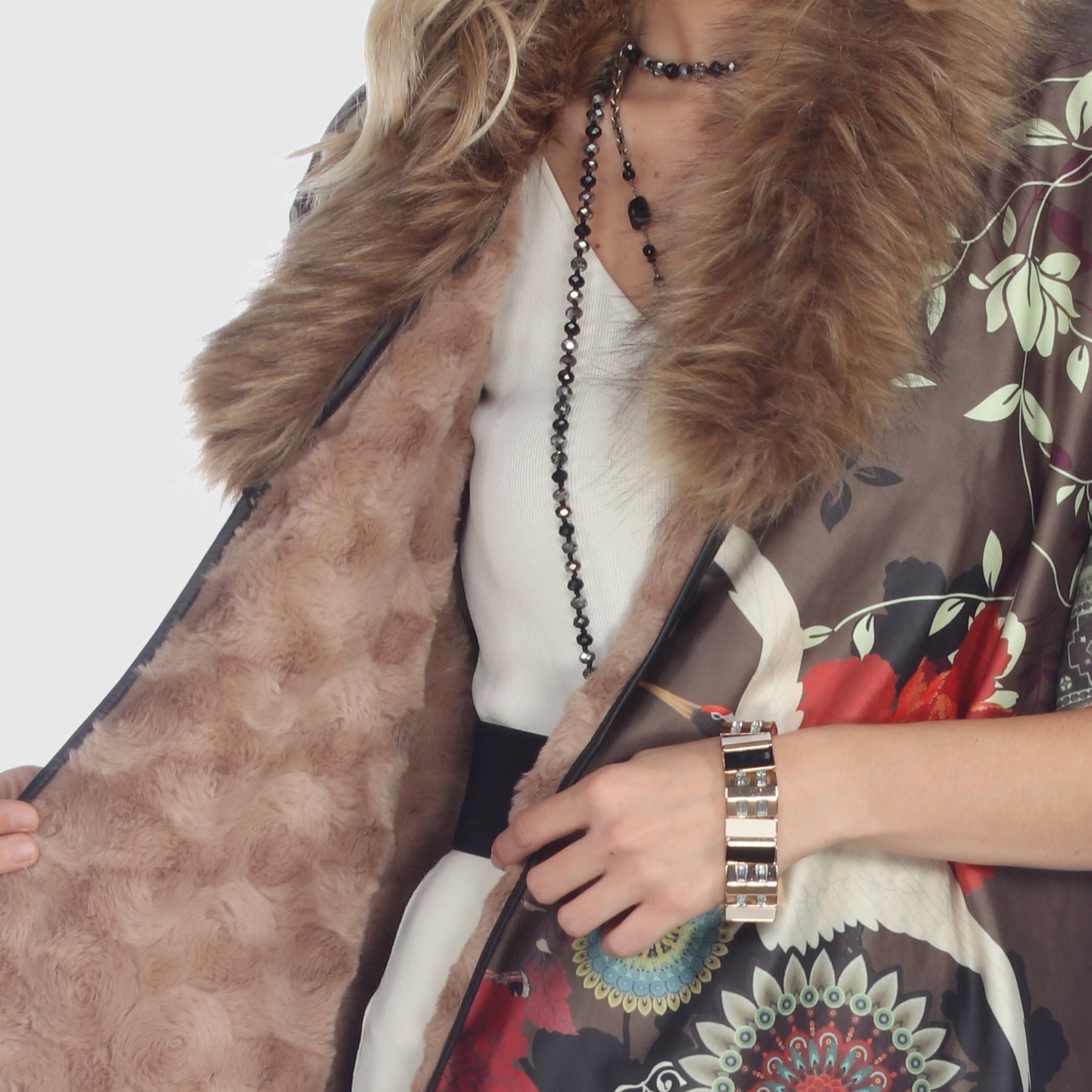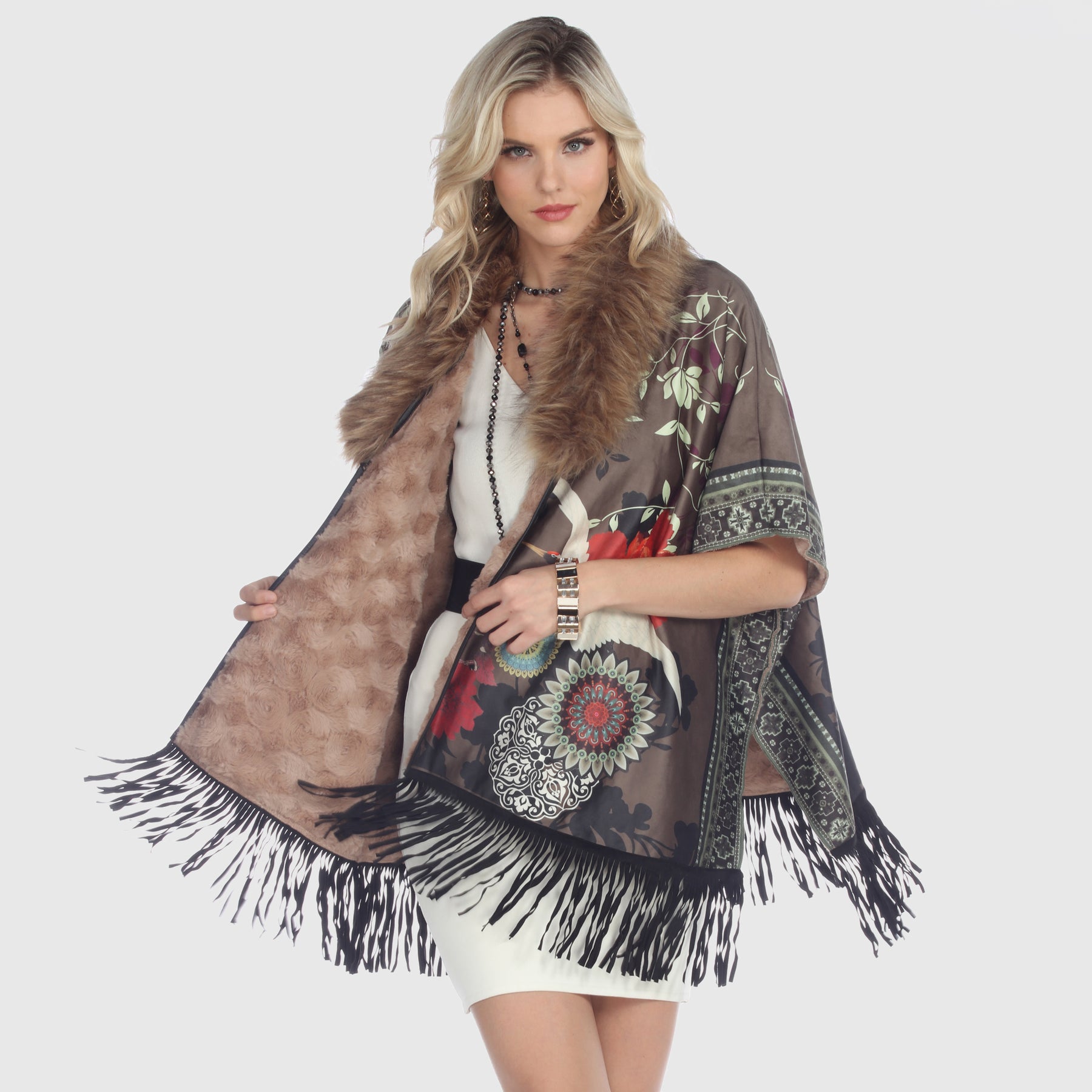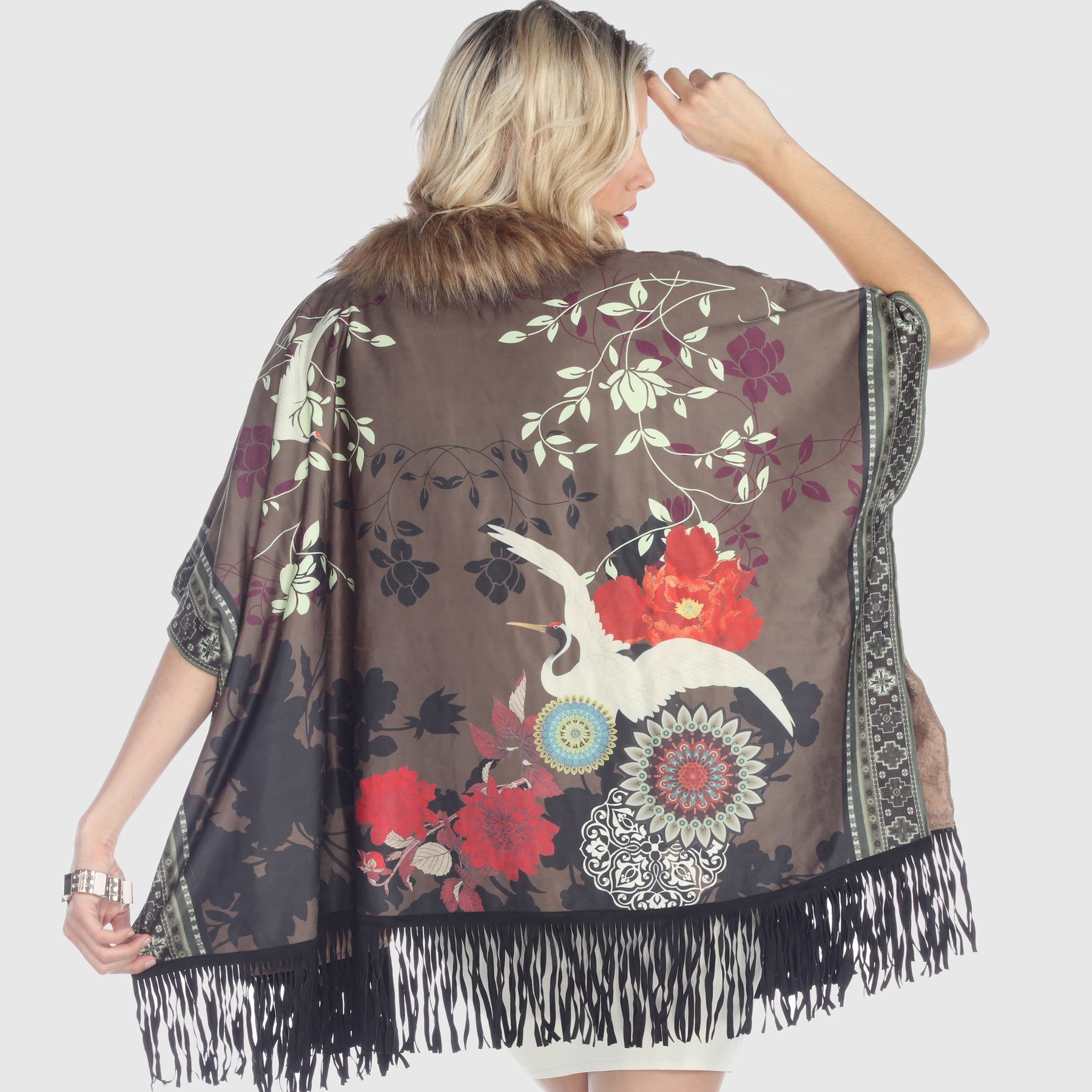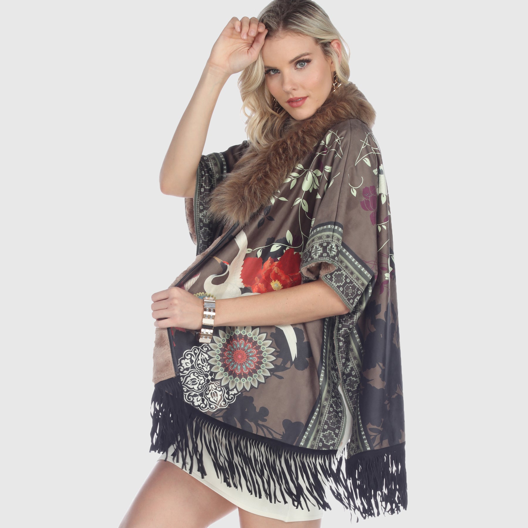 The Boho Faux Fur Trim Poncho is crafted from soft suede-like 100% polyester, offering a warm and comfortable feel with effortless drape. Designed with an open front, mid-length silhouette, and finished with plush faux fur trim, it delivers cozy texture and a relaxed bohemian vibe. The subtle bird-inspired pattern adds a touch of character, making it perfect for cool days, casual outings, or layered moments of easy comfort. Machine wash cold; avoid bleach and ironing.