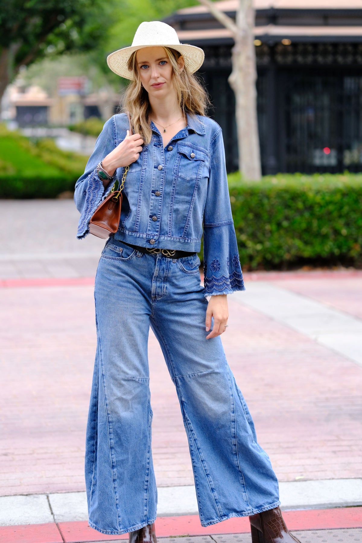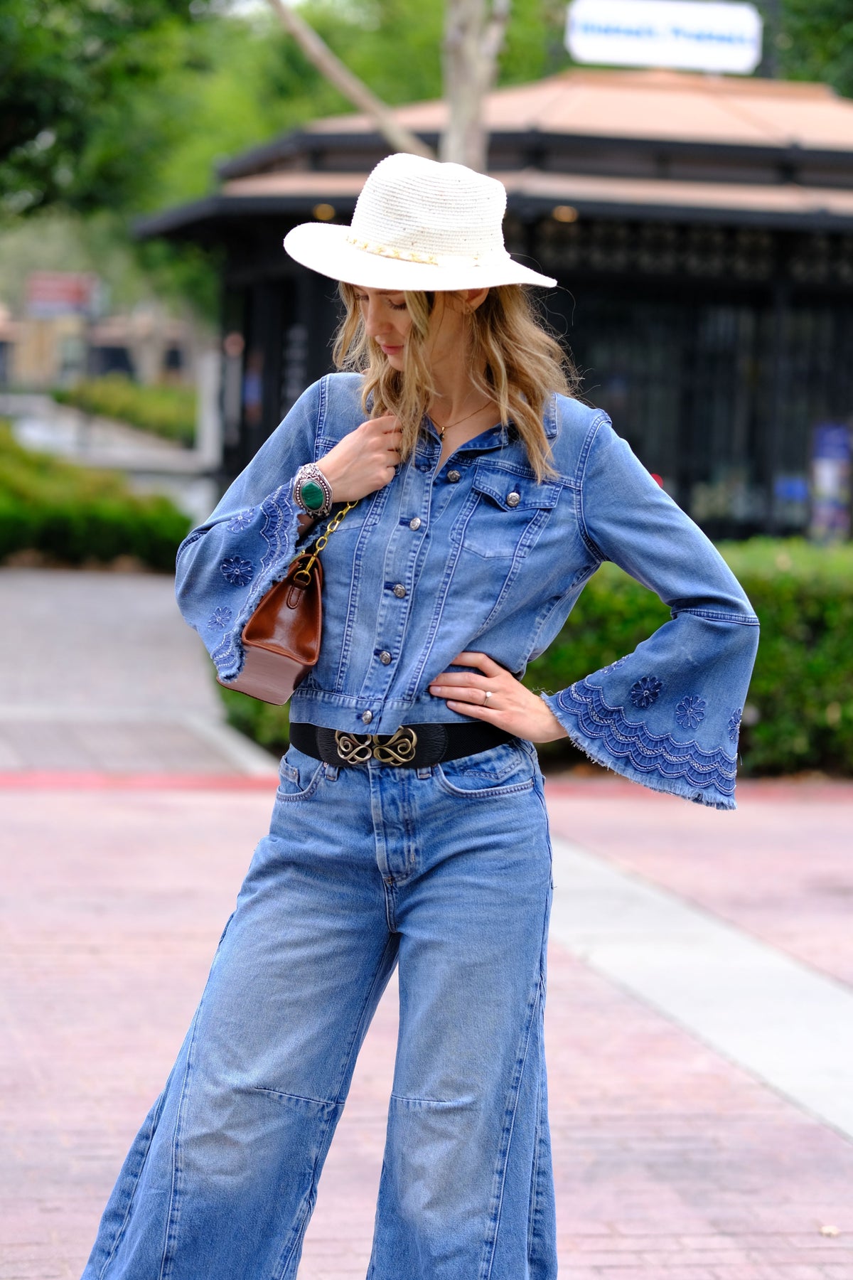 The Boho Belle Denim Jacket is crafted from a soft, stretchable blend of lyocell, polyester, and spandex. This short denim jacket features floral embroidery with bead accents, a shirt collar, and round buttons for a chic bohemian look. Machine washable and easy to care for.