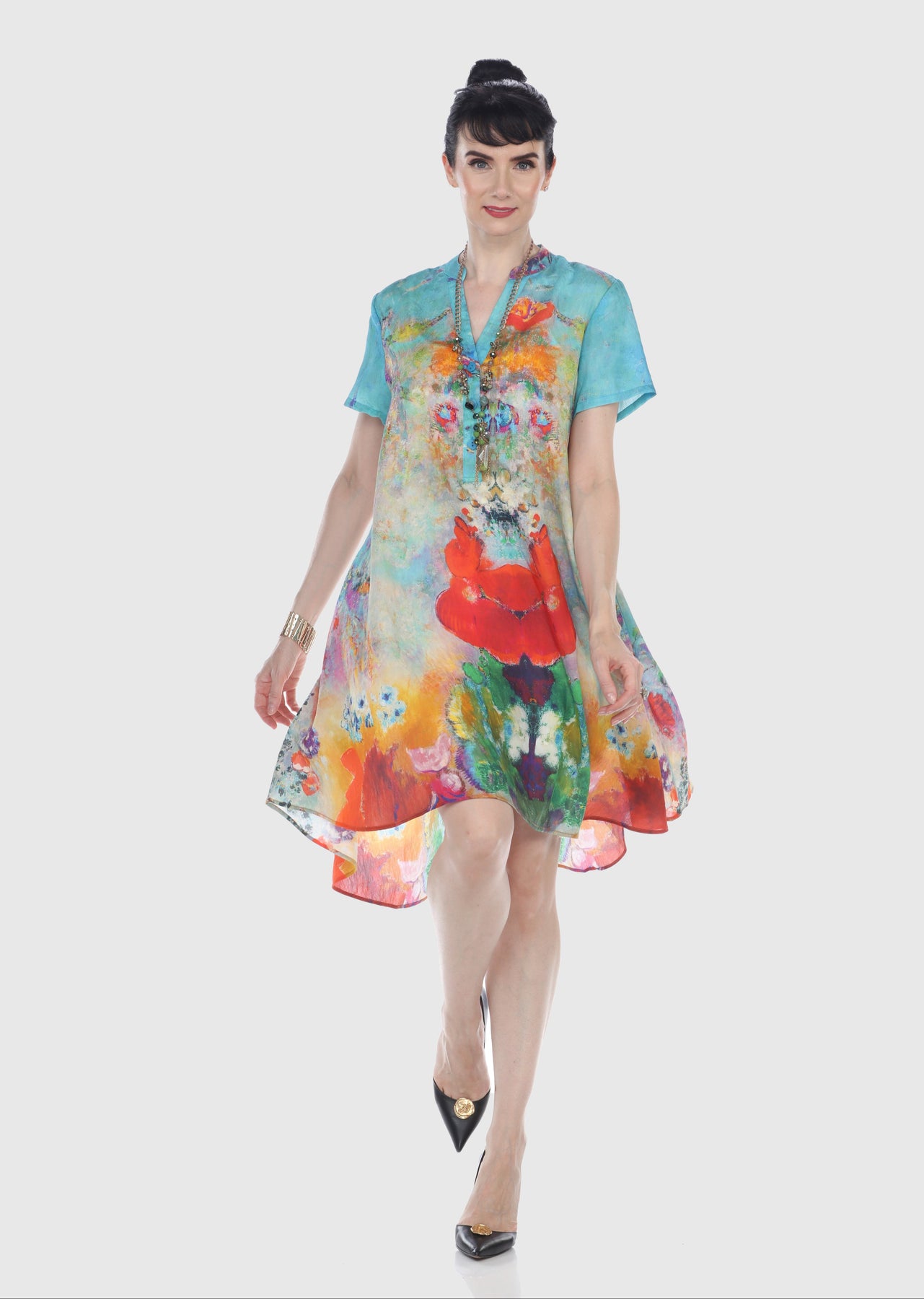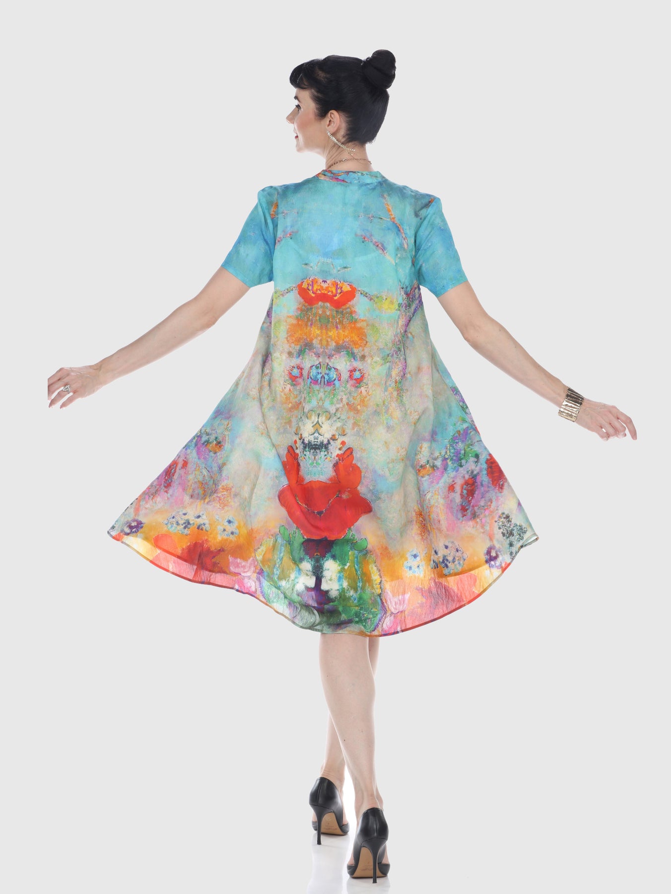 From the center back neckline, measure 15 inches straight down. At that point, measure straight across the dress from one side to the other. This flat width is your waist measurement (double for full body circumference).