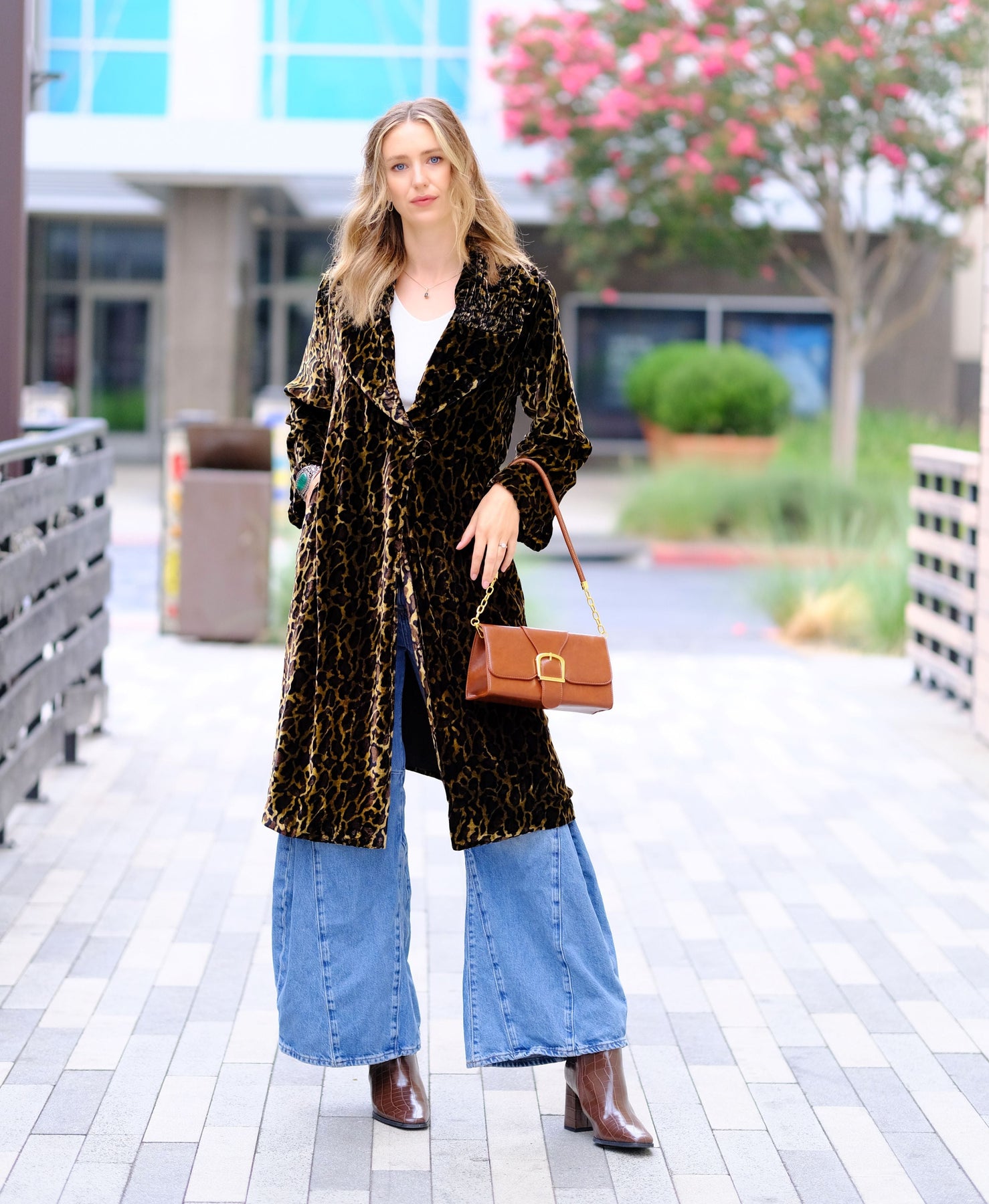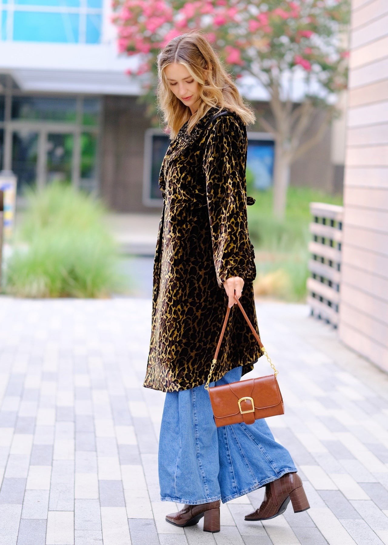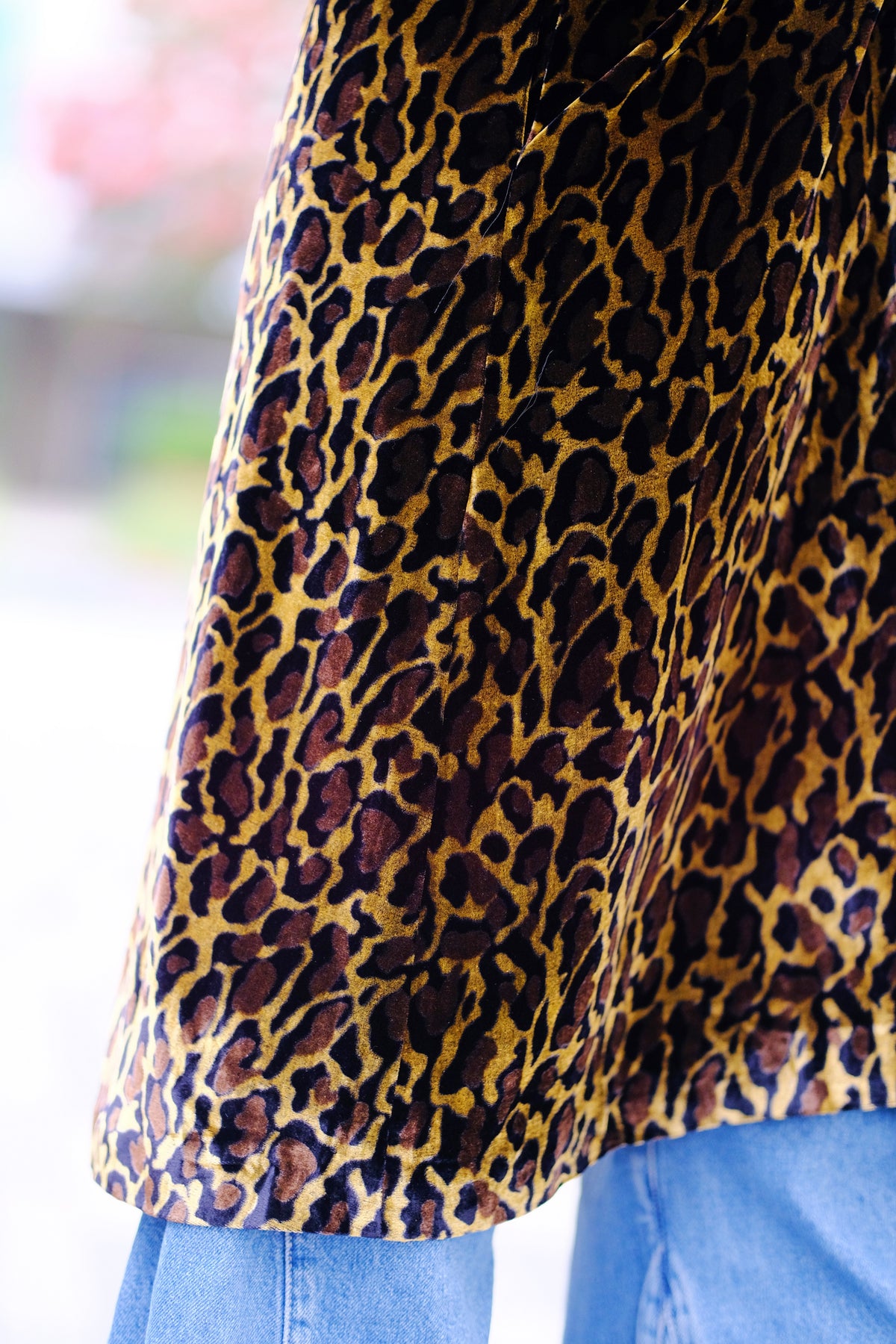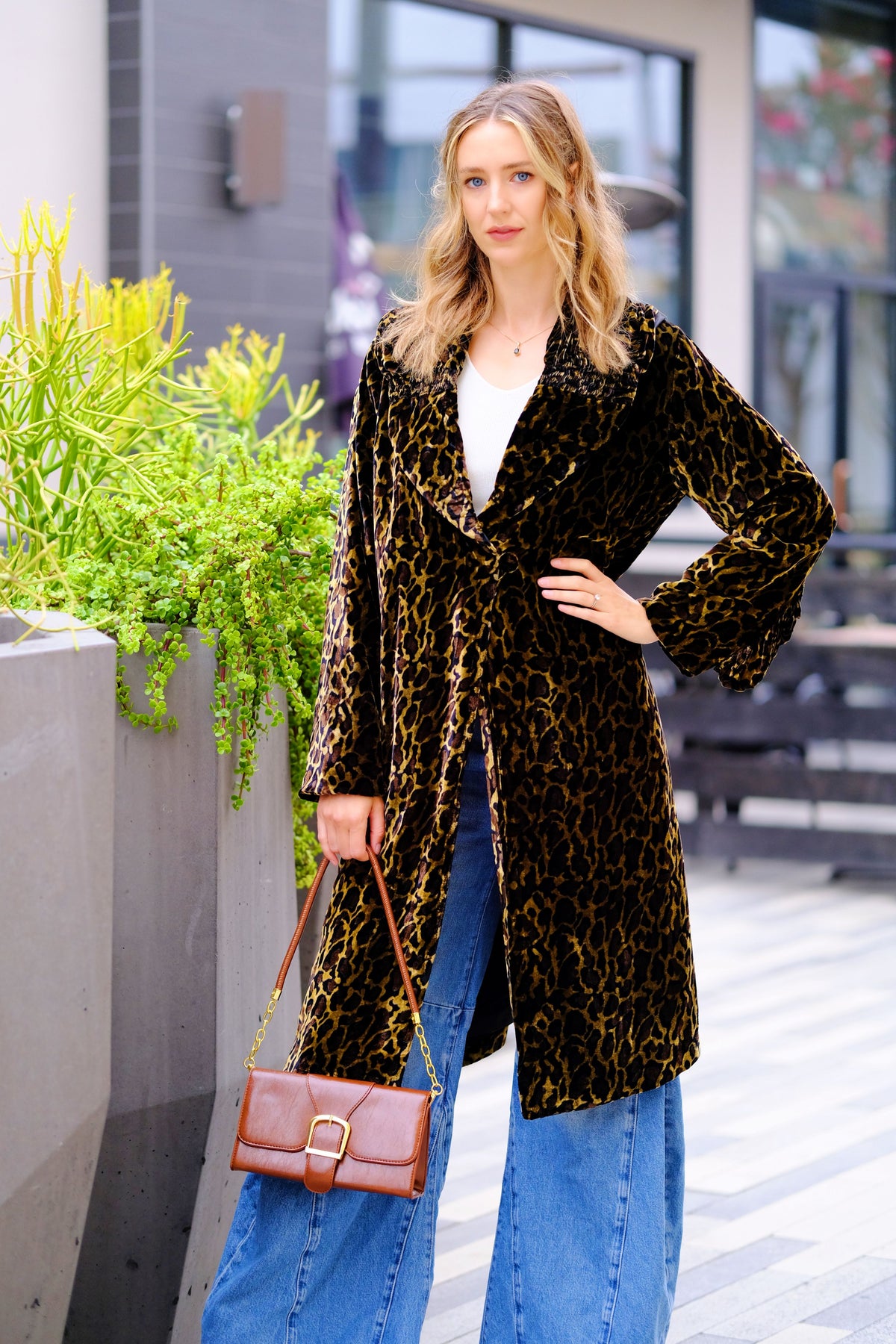 The Velvet Wildcat Duster Coat is crafted from 100% silk velvet, offering a plush, luxurious feel with a natural, elegant drape. Designed with a notched lapel, full-length sleeves, and a long silhouette, it delivers refined comfort and a striking presence. The leopard-inspired pattern adds a bold, modern edge—perfect for evening outings, special gatherings, or moments when you want effortless sophistication. Hand wash cold; avoid bleach and ironing.