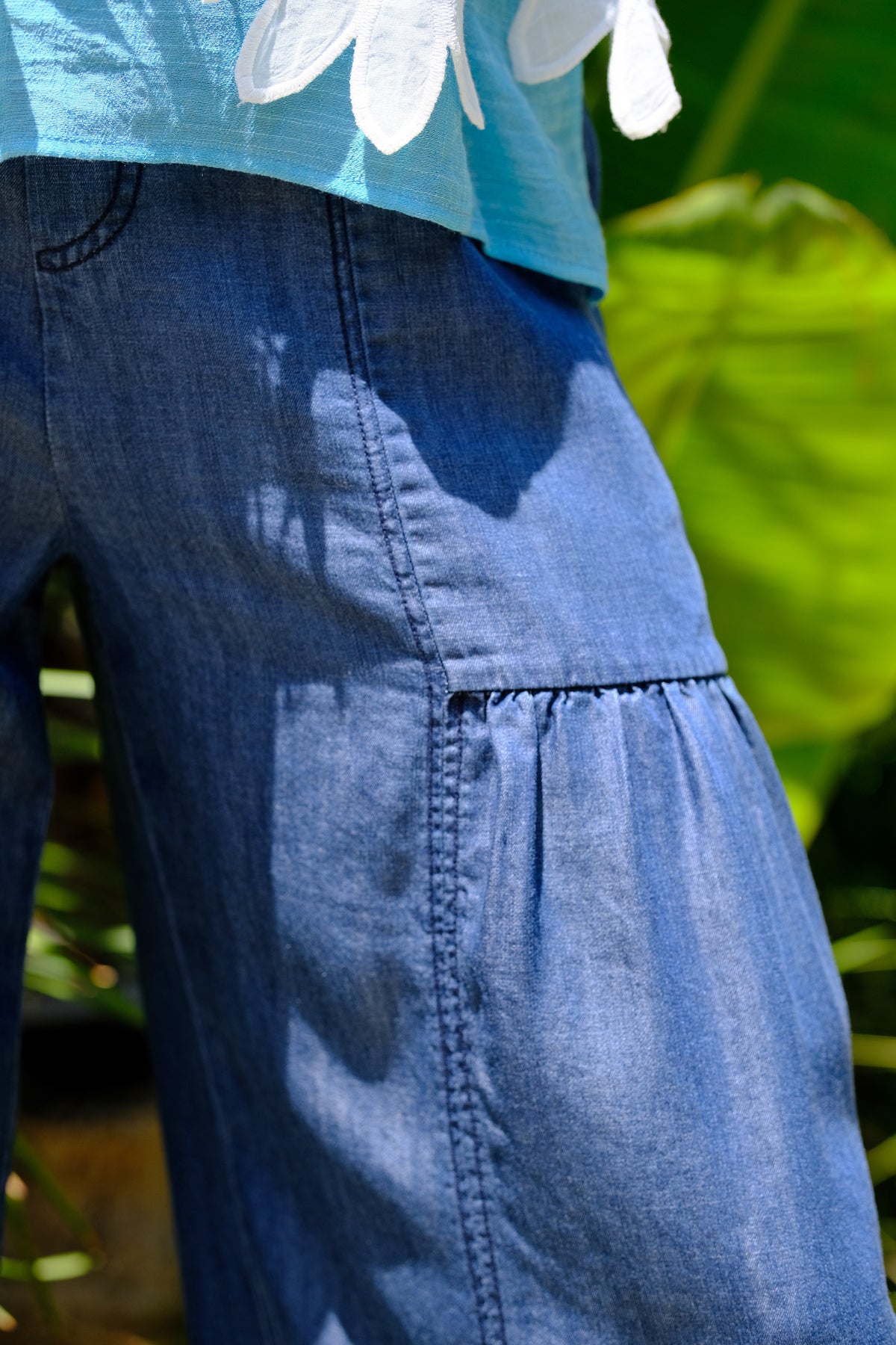 Crafted from 100% polyester, the Seaside Tiered Chambray Pant offers a soft, lightweight feel with an easy, flowy drape. Its tiered design creates natural movement and comfort, making it ideal for warm days, beach outings, or casual, relaxed moments. Machine wash cold; avoid bleach and ironing.