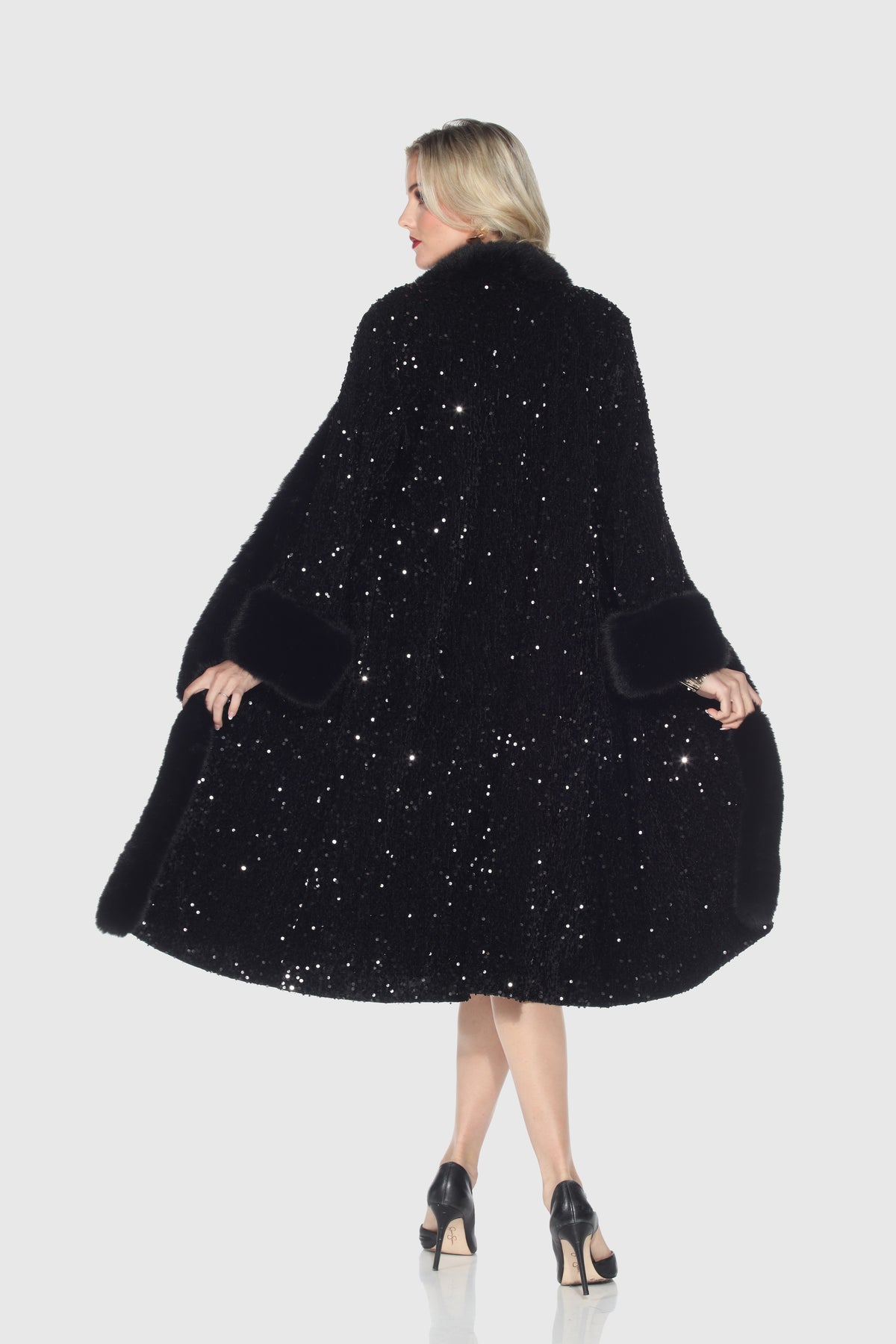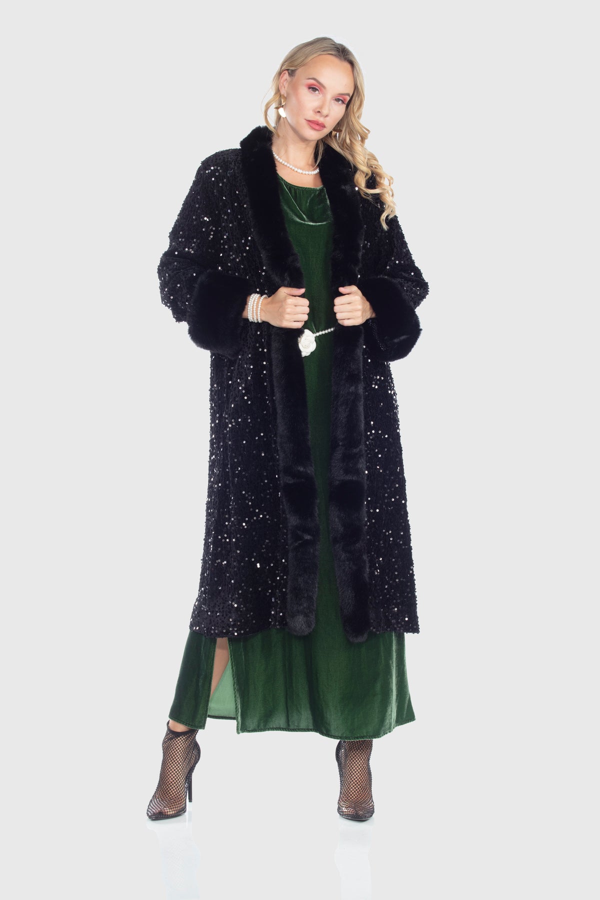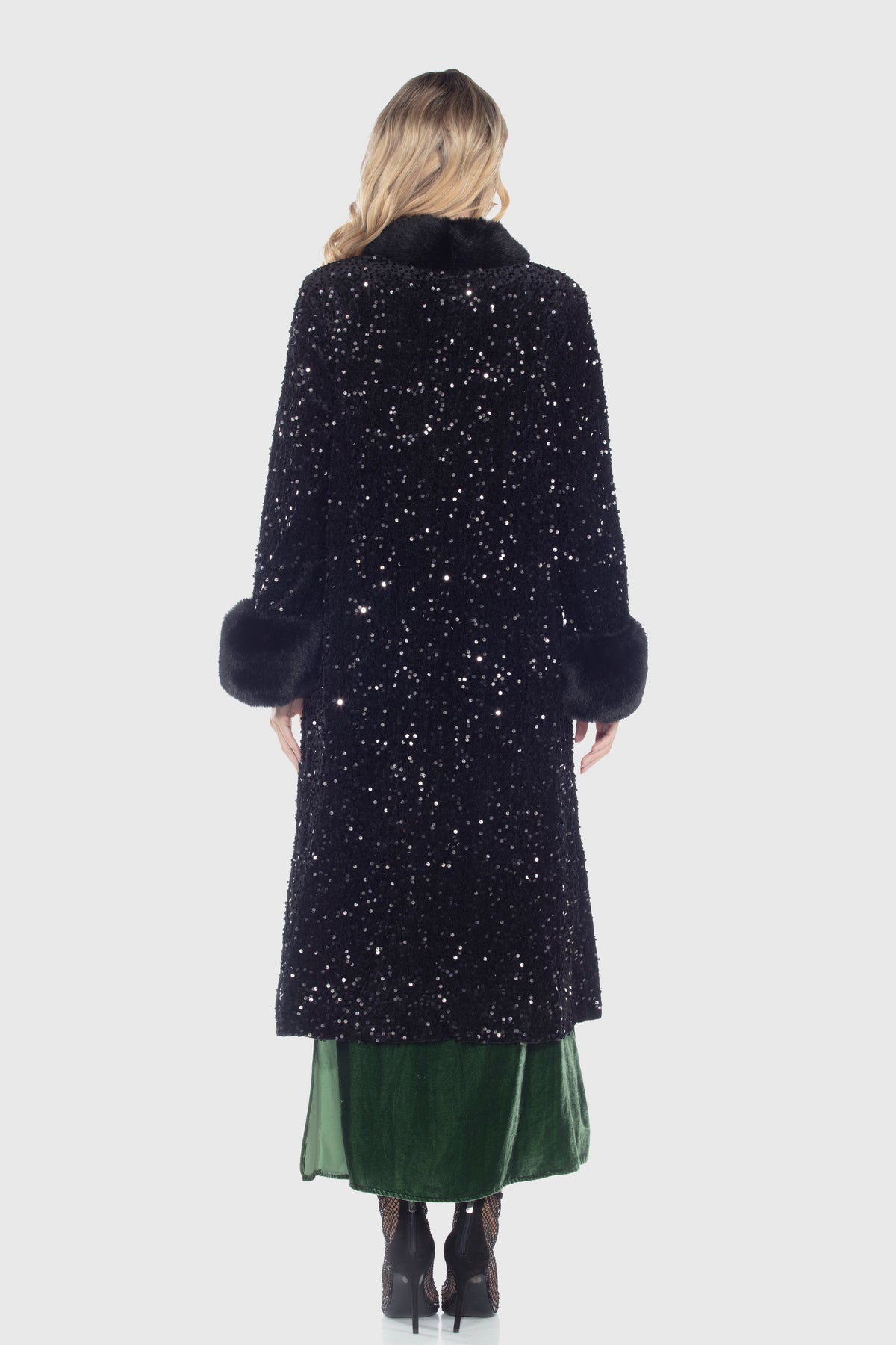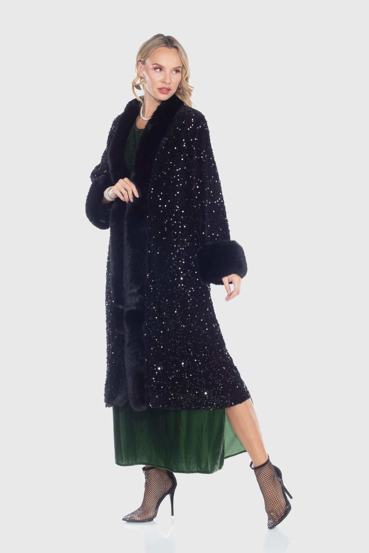 The Black Sequin Long Coat with Faux Fur combines velvet fabric with sequin embellishments and a faux fur trim for a glamorous look. Featuring long sleeves, a shawl collar, and a hook-and-eye closure, it’s a stylish, warm outerwear piece that’s hand wash only.