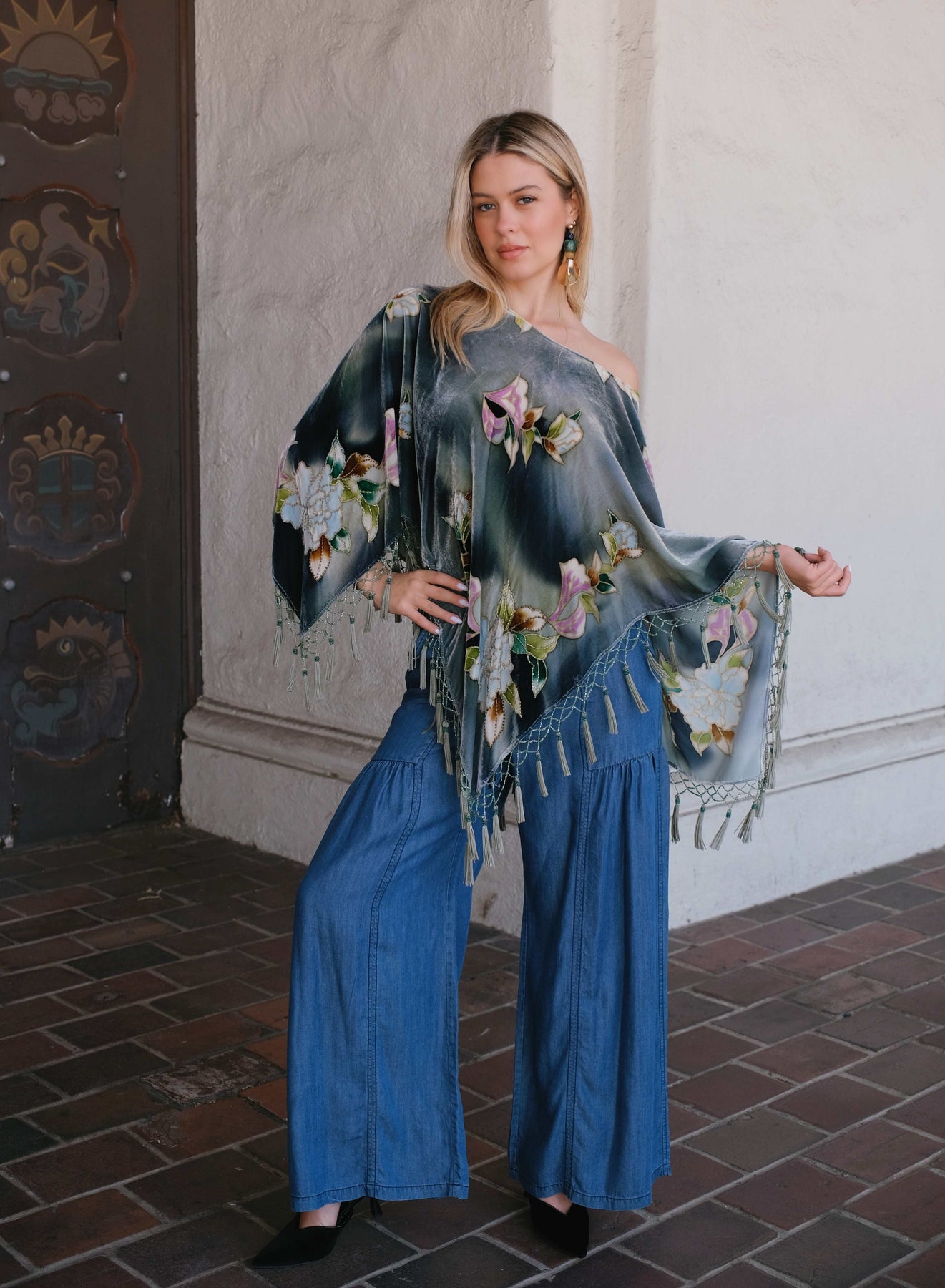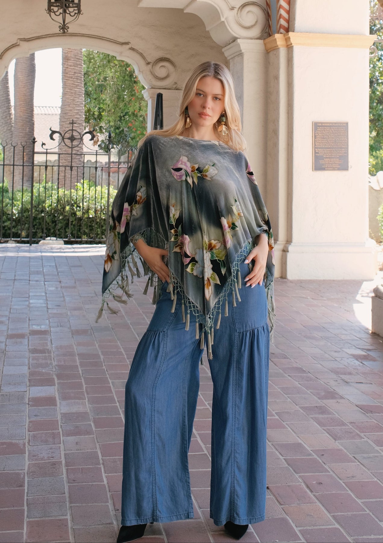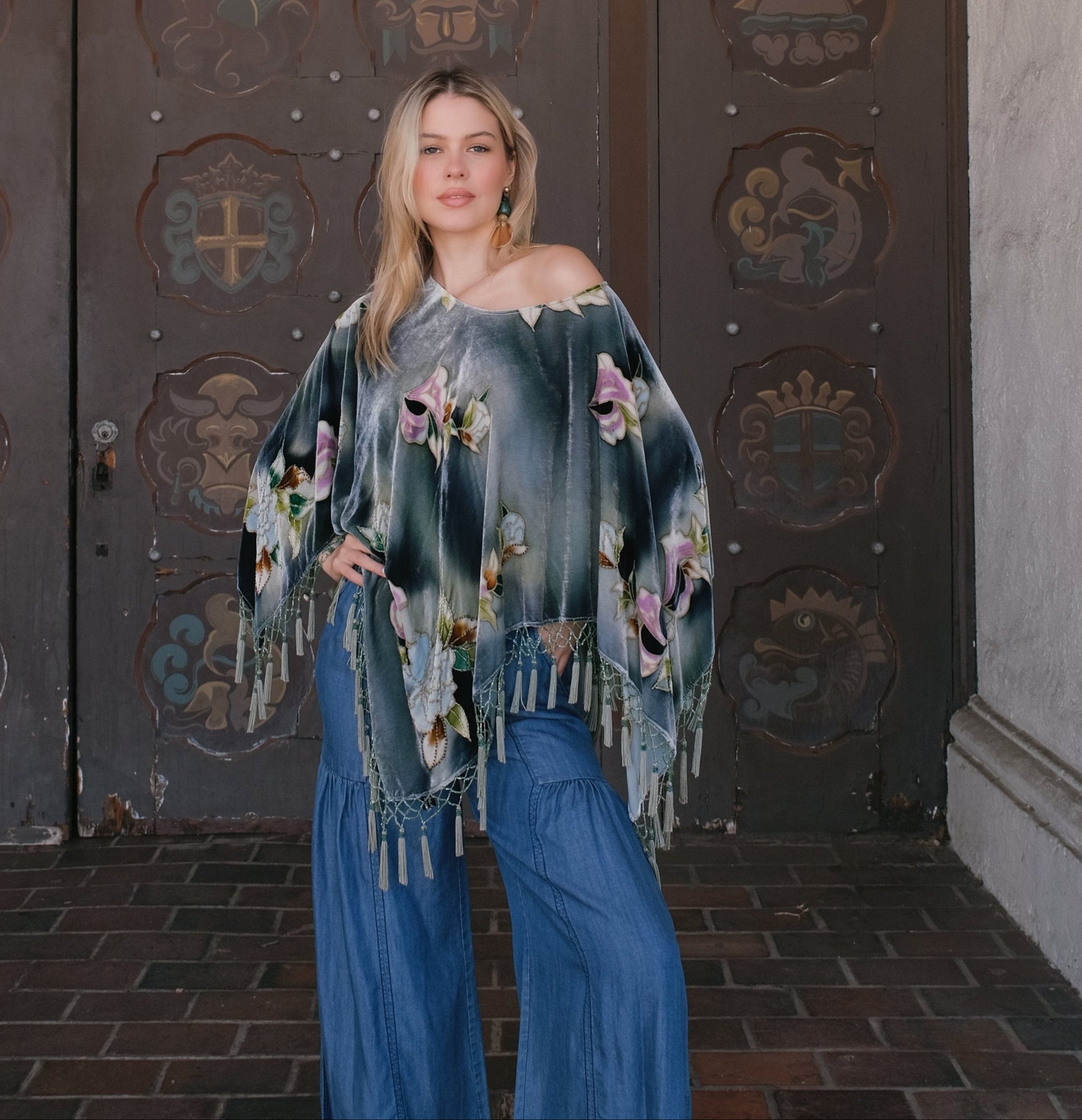 The Floral Short Velvet Poncho is a luxurious accessory made from 70% silk and 30% rayon velvet. Featuring a floral pattern, beaded embellishments, and a round collar, this short poncho offers a chic, sleeveless design perfect for layering. Machine washable in cold water for easy care.