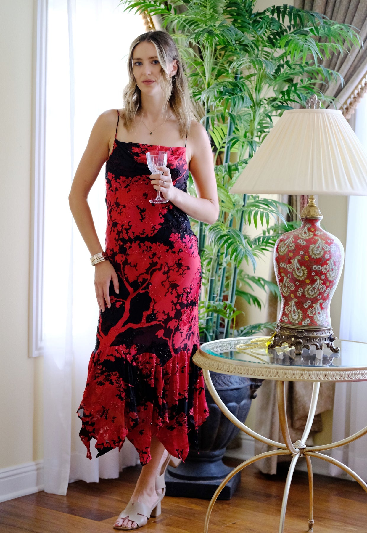 The Midnight Bloom Slip Dress is made from 100% pure silk, offering a smooth, lightweight feel against the skin. Its spaghetti straps and cowl neckline create a simple yet elegant silhouette. Subtle beaded details add a soft shimmer to the floral pattern, making it suitable for dinners, events, or any relaxed evening moment. Hand wash in cold water; avoid bleach and ironing.
