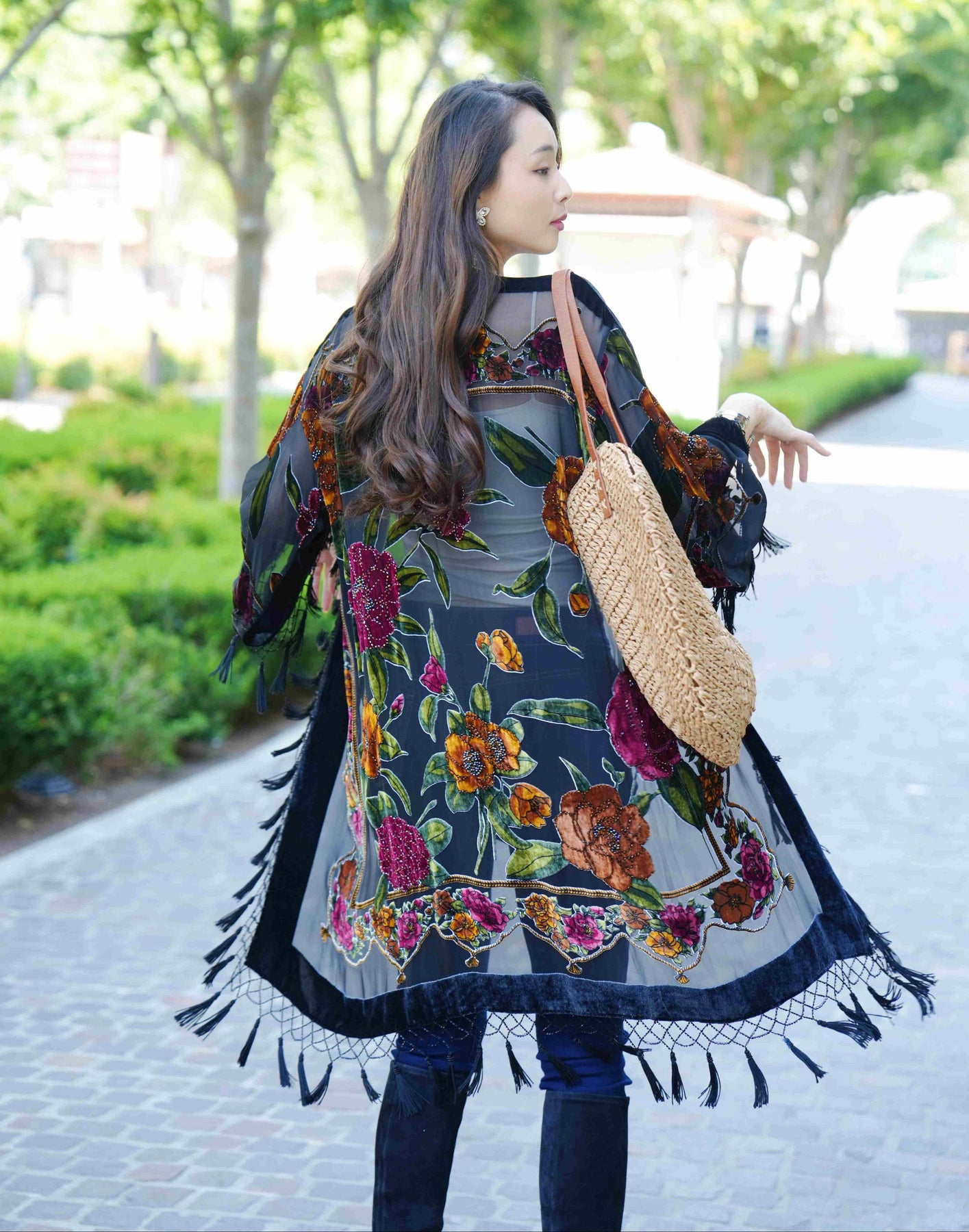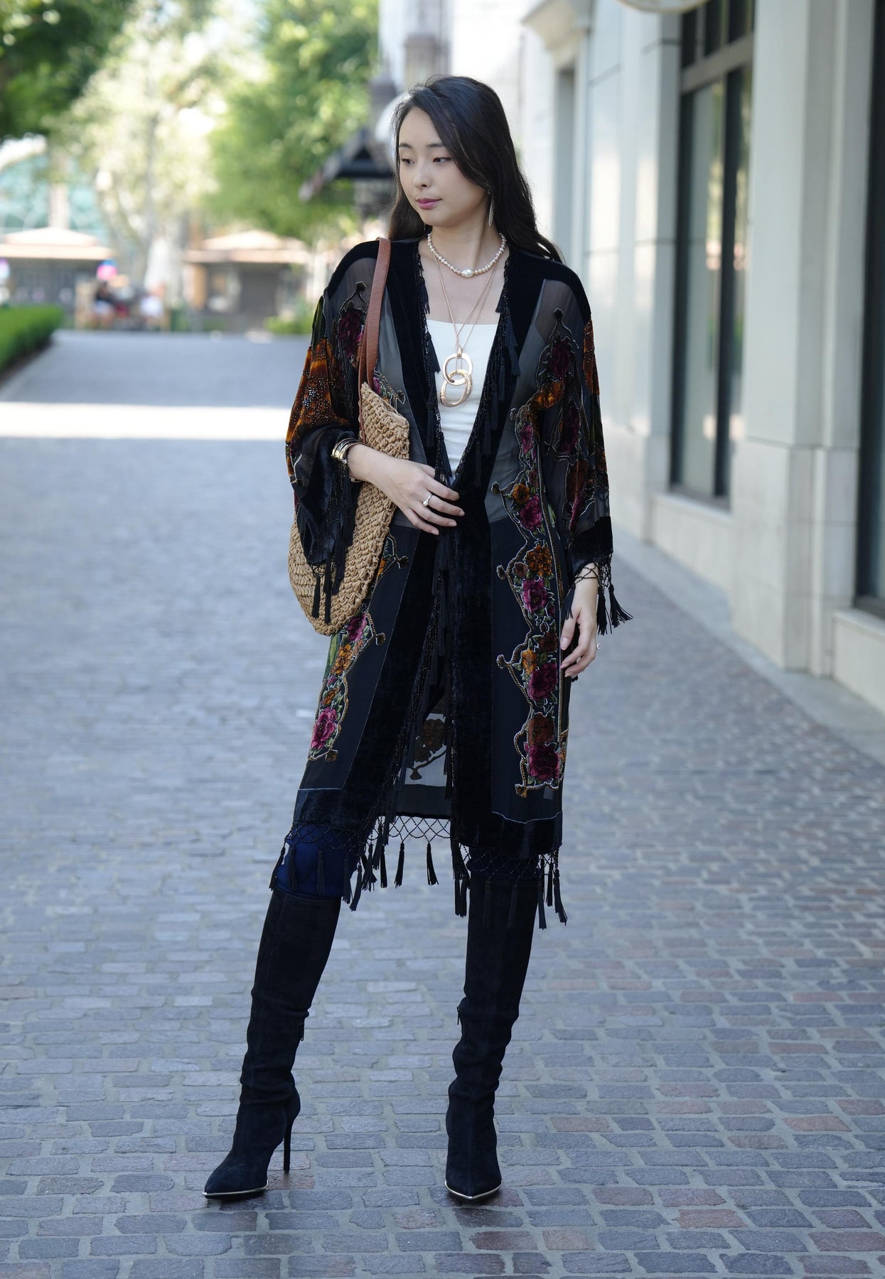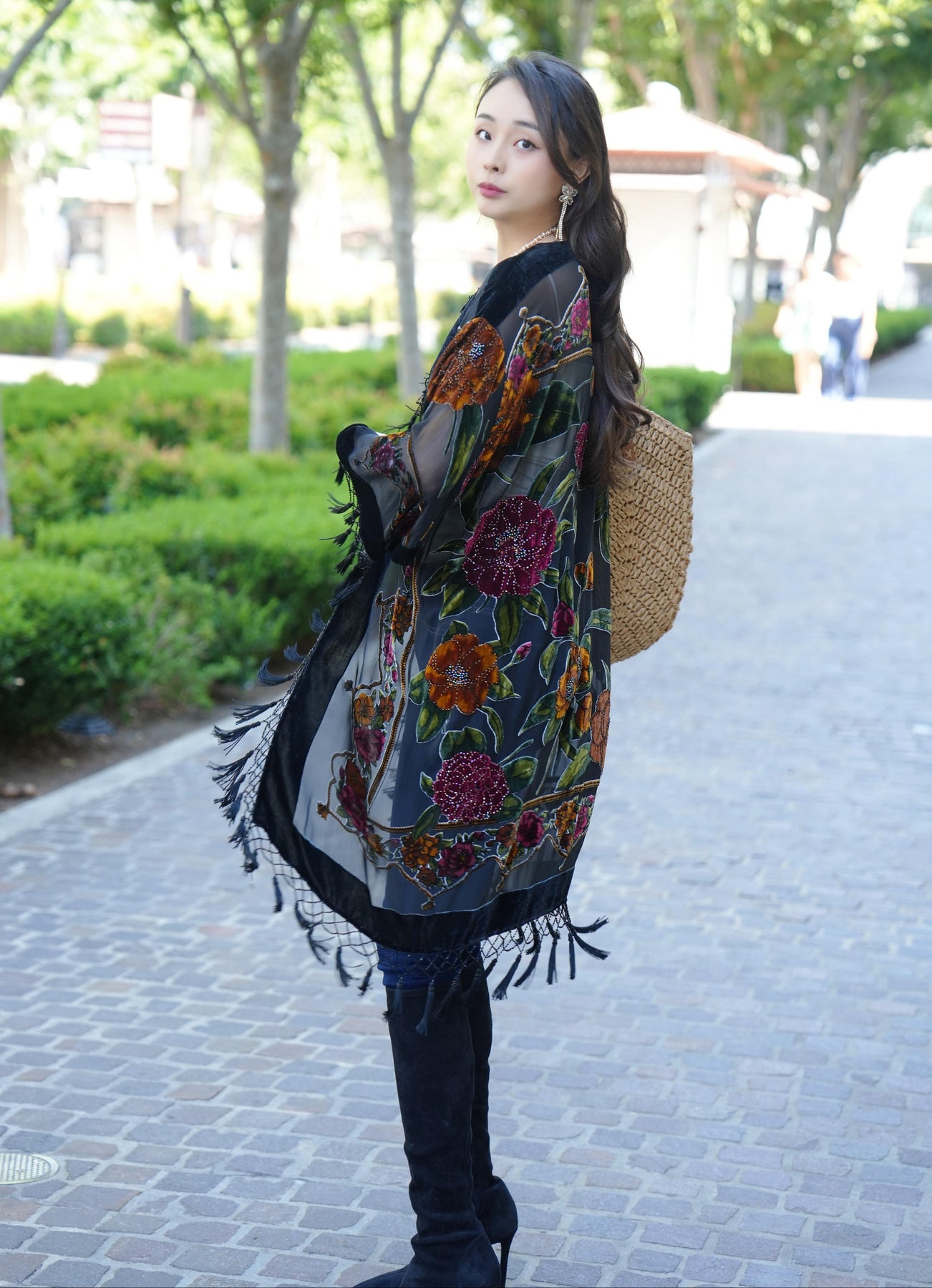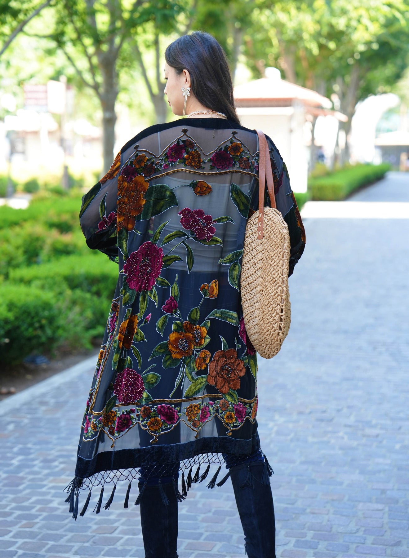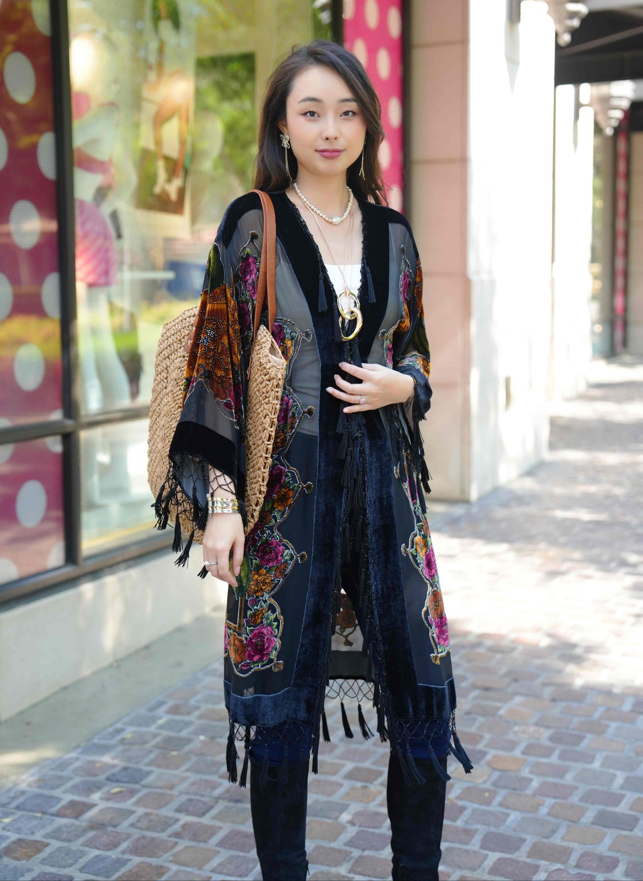 The Silk Full-Length Sleeve Kimono is a luxurious accessory made from 70% silk and 30% rayon. With a delicate floral pattern and long sleeves, this kimono features an open front for an elegant, flowing silhouette. Dry clean only to preserve its premium fabric and intricate design.