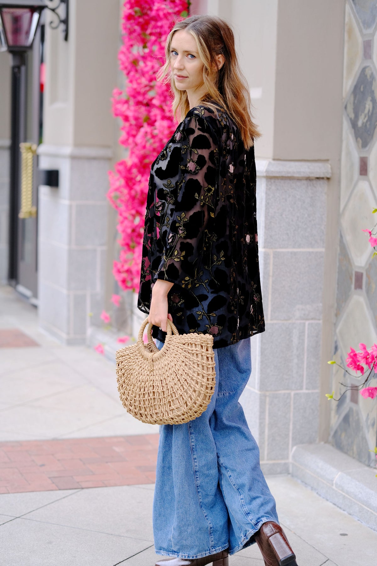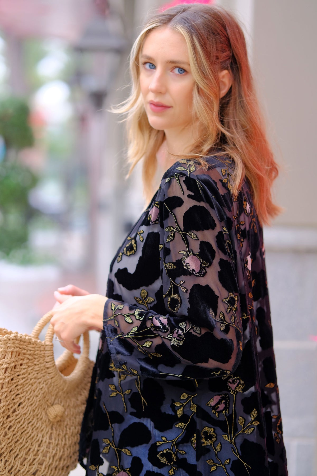 The Midnight Velvet Burnout Blouse is a luxurious short blouse made from a soft velvet blend of 70% rayon and 30% nylon. Featuring a subtle floral burnout pattern, it offers full-length sleeves and an open front for a refined, feminine look. This blouse is designed for comfort and elegance, suitable for both casual and dressy occasions, and requires dry cleaning for proper care.