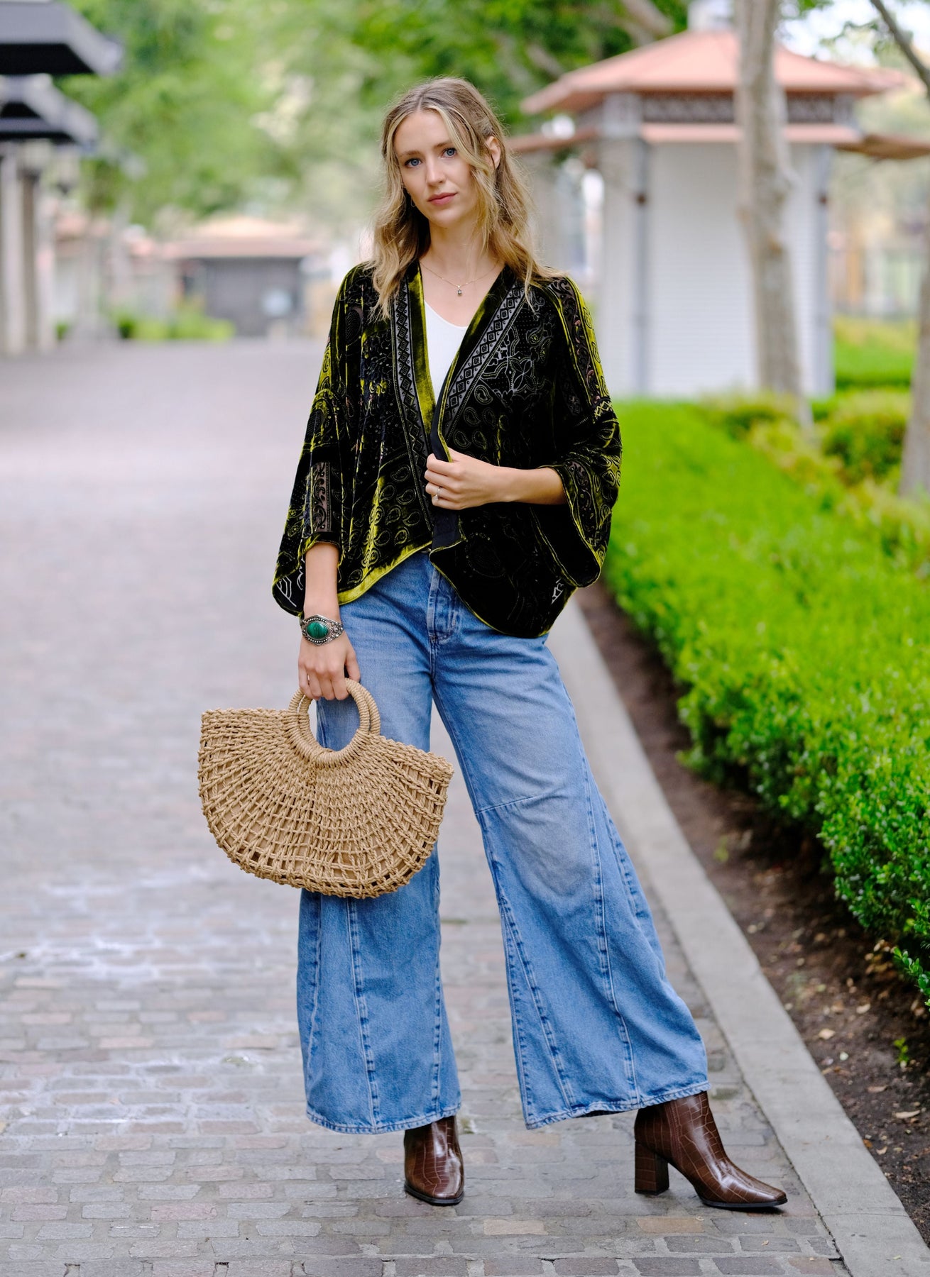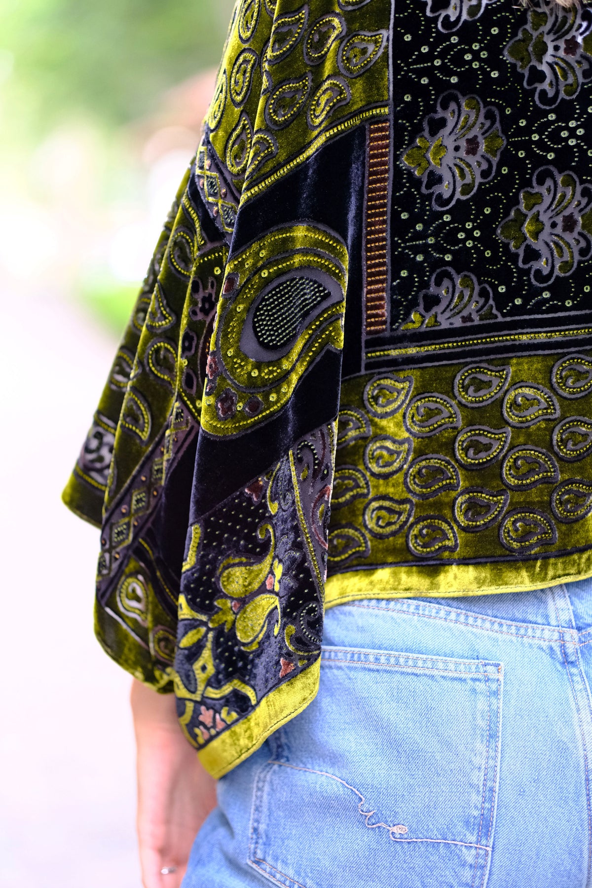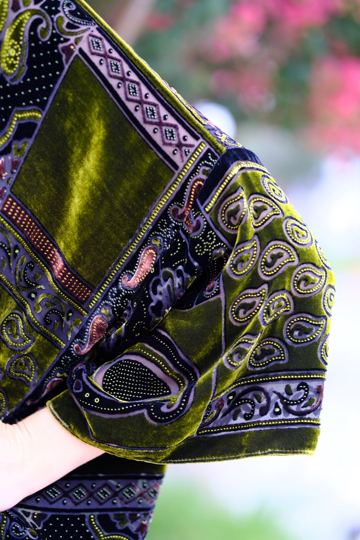 The Olive Luxe Velvet Kimono is a luxurious cropped kimono made from 70% silk and 30% rayon. Featuring a paisley pattern, 3/4-length sleeves, and an open front design, it offers an elegant and refined look. Dry clean only to maintain its premium quality.