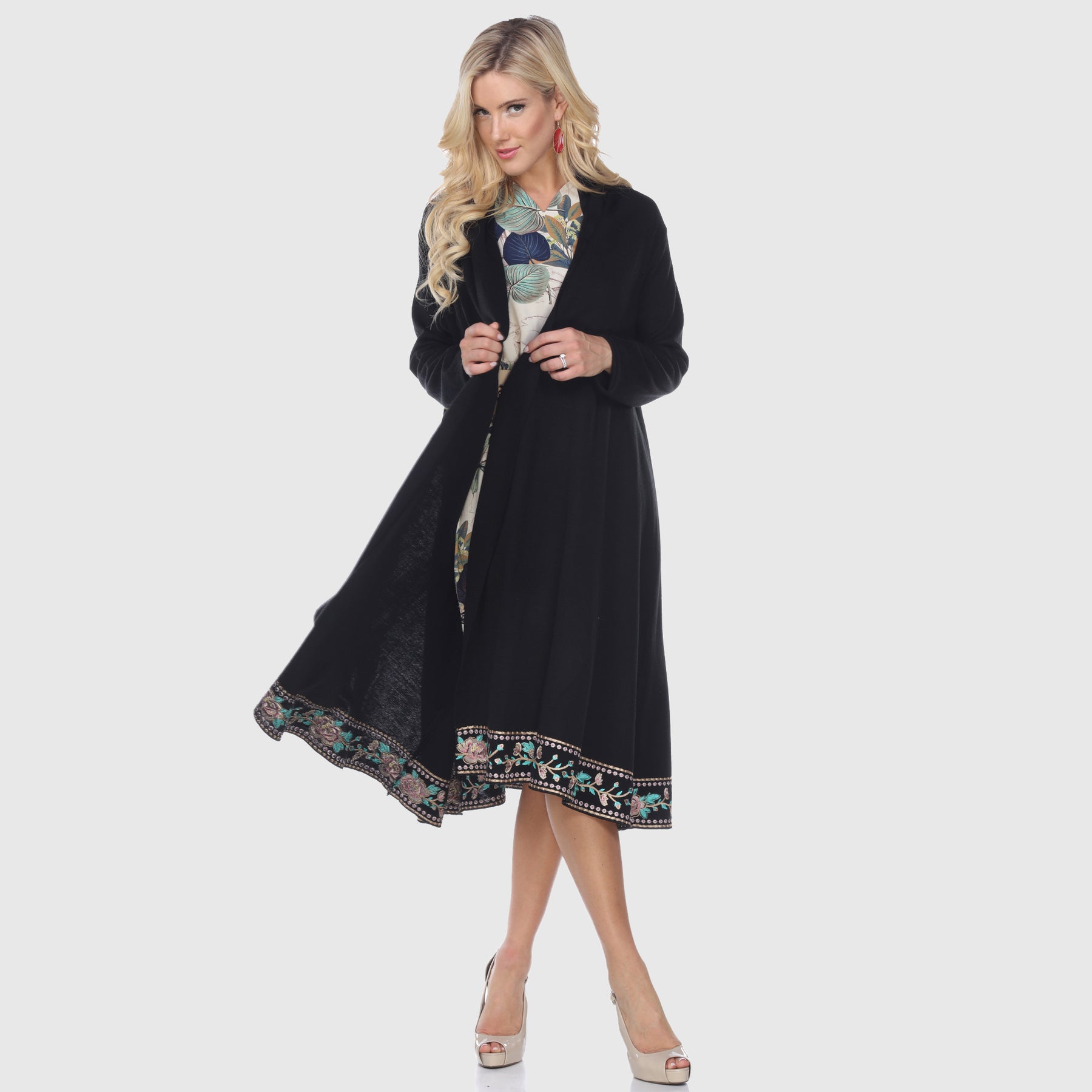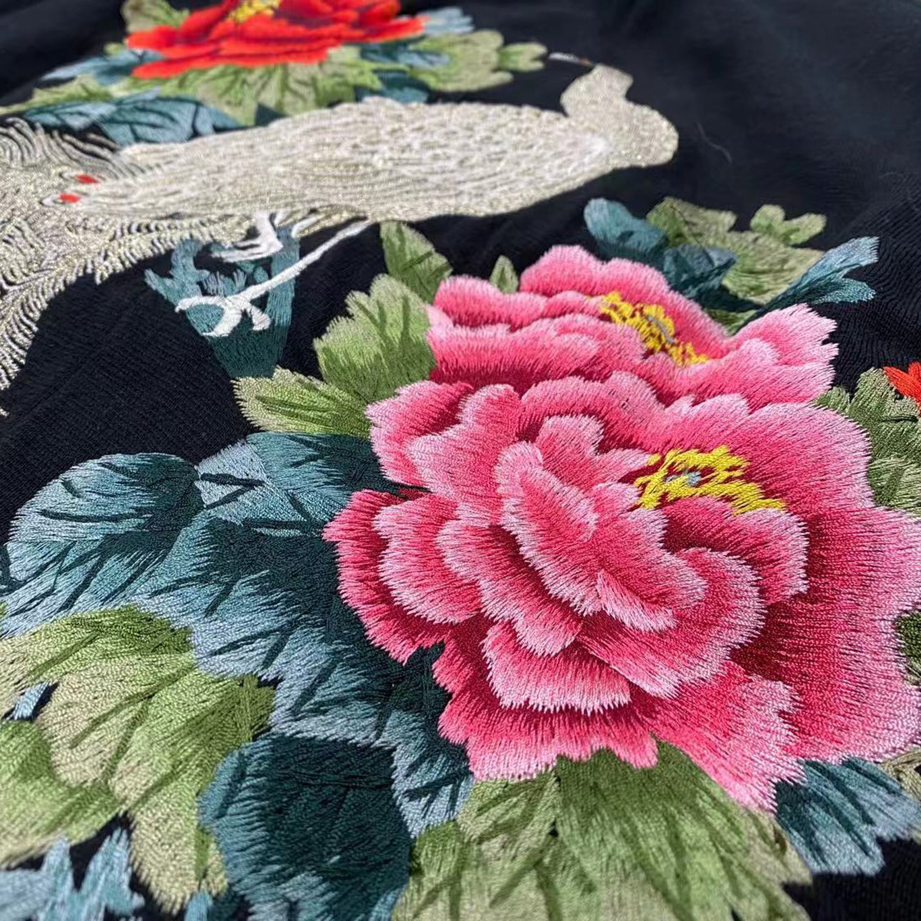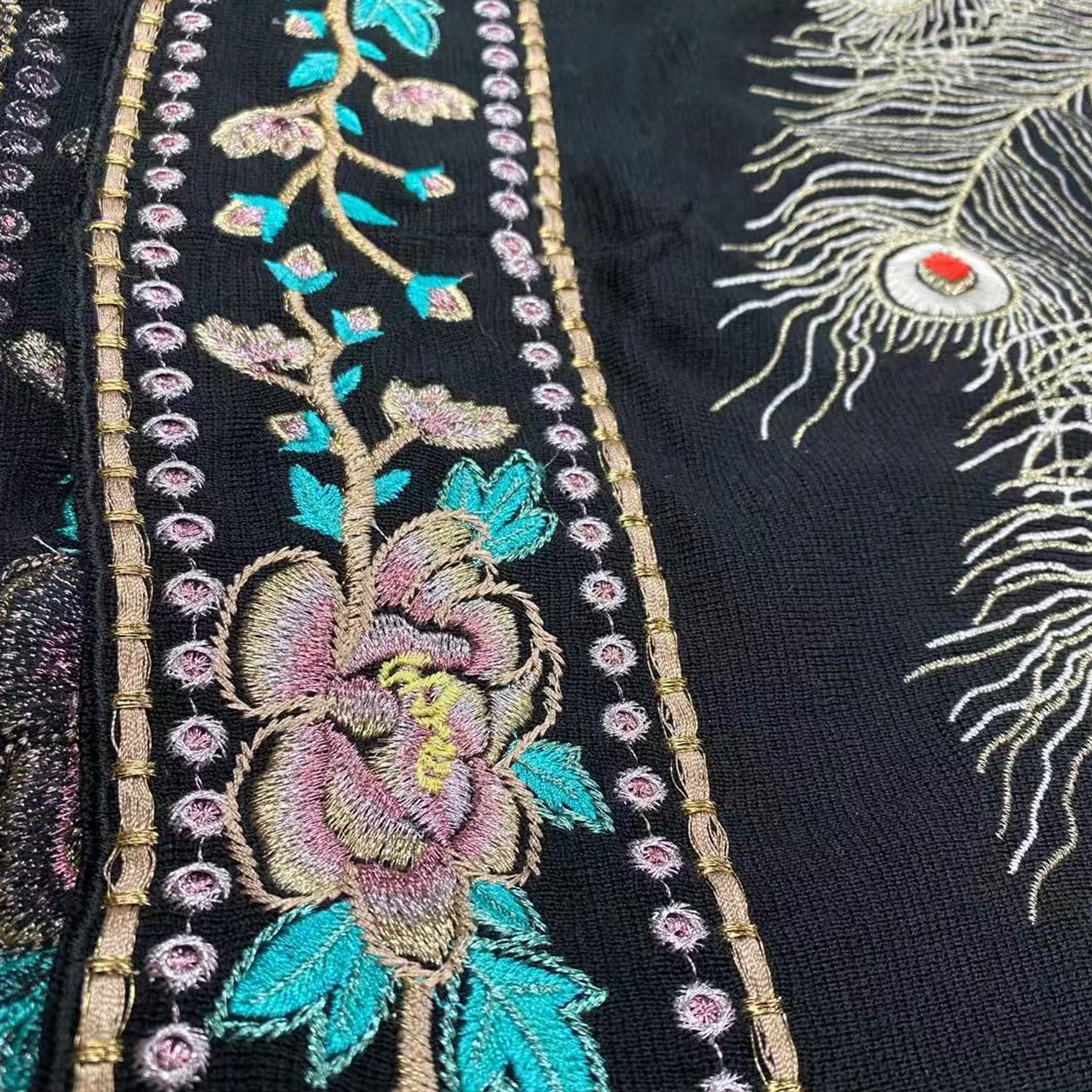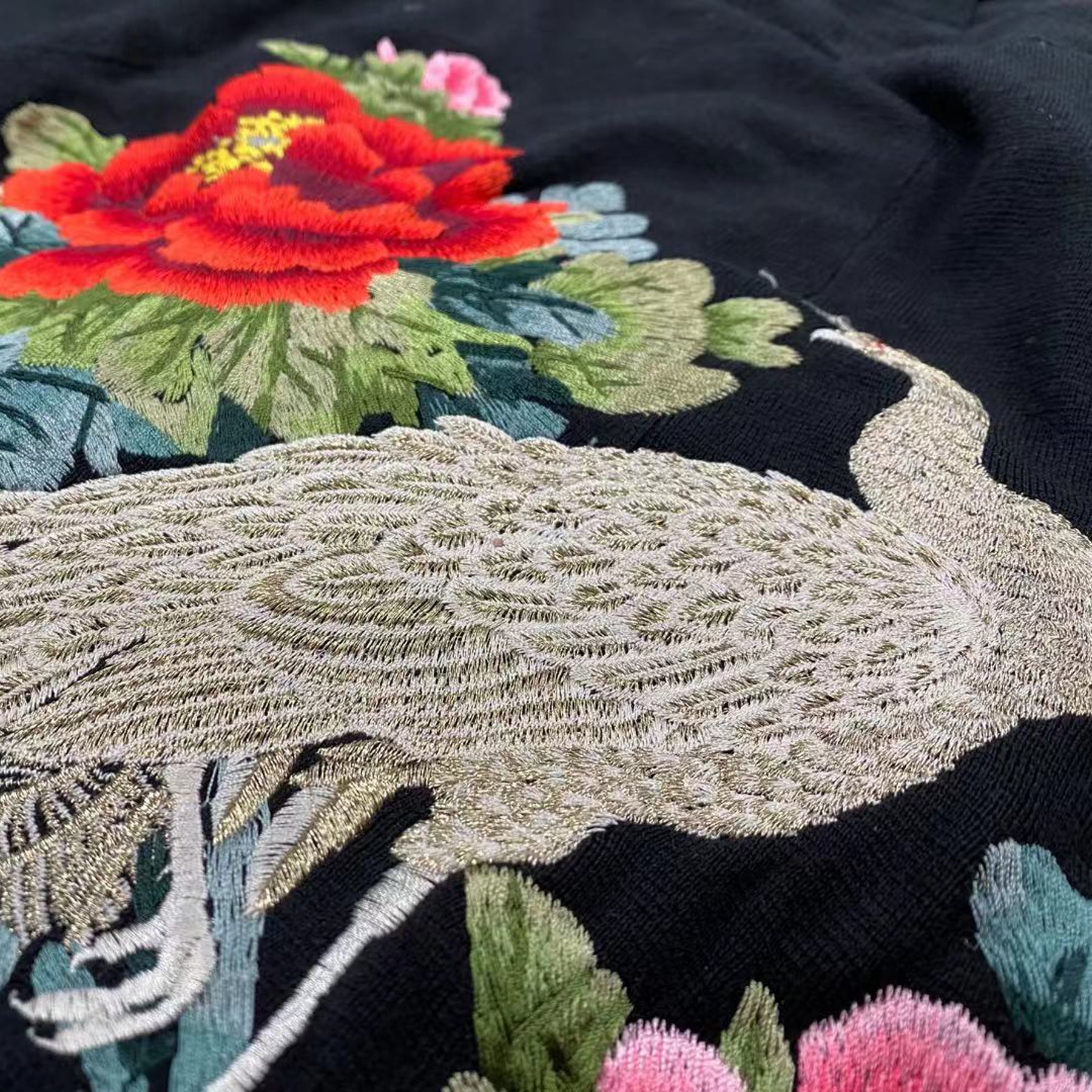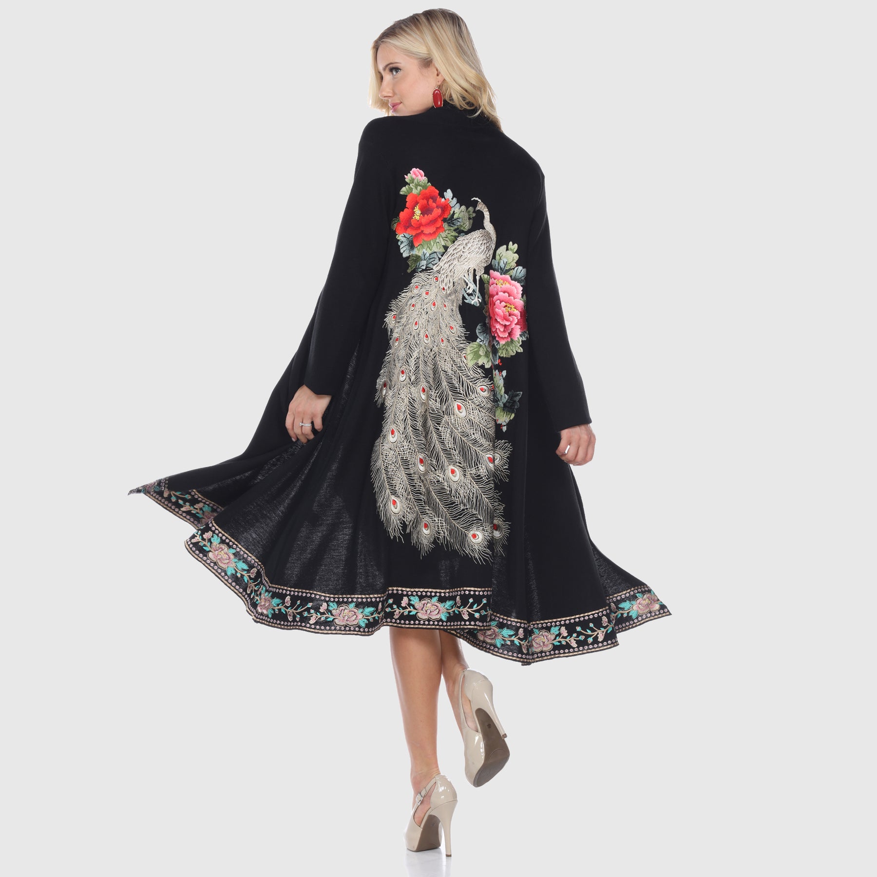The Peacock & Floral Embroidery Jacket is a beautifully crafted piece made from a soft knit blend of 70% acrylic fiber and 30% wool. Featuring intricate peacock and floral embroidery, this long jacket offers an elegant and artistic touch. Designed with full-length sleeves and an open front, it provides comfort and sophistication. For care, dry cleaning is recommended, and low-heat ironing helps maintain its refined texture.