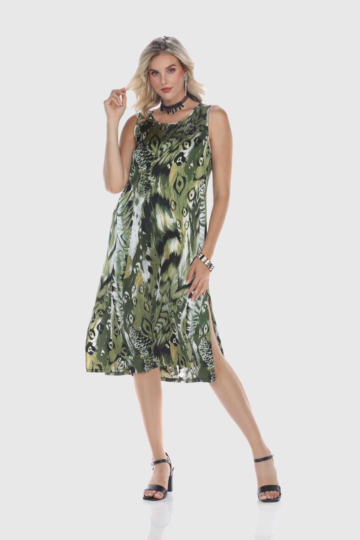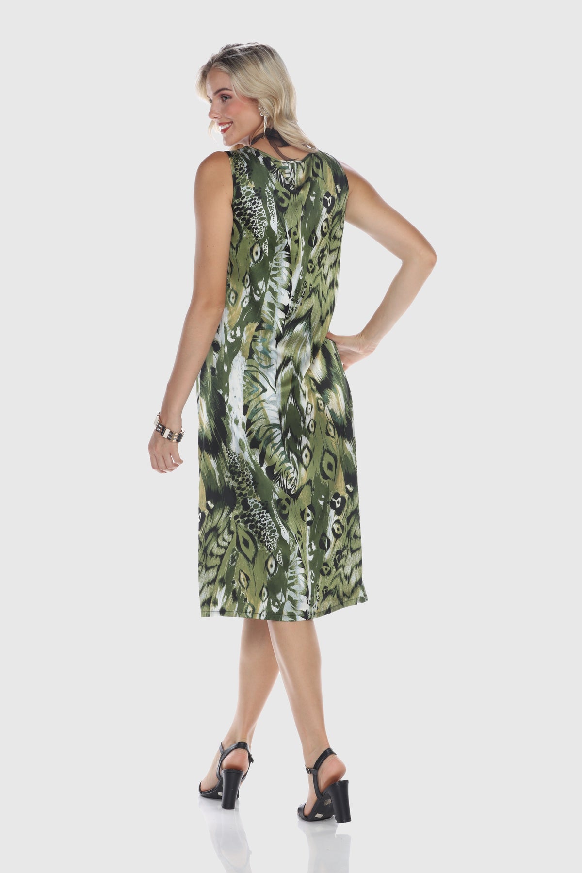 The Peacock Feather Midi Dress is a stunning sleeveless dress made from 100% polyester. Featuring a round neck and a bold animal-inspired pattern, this mid-length dress is both stylish and easy to care for. It’s machine washable in cold water, making it a practical and fashionable choice.
